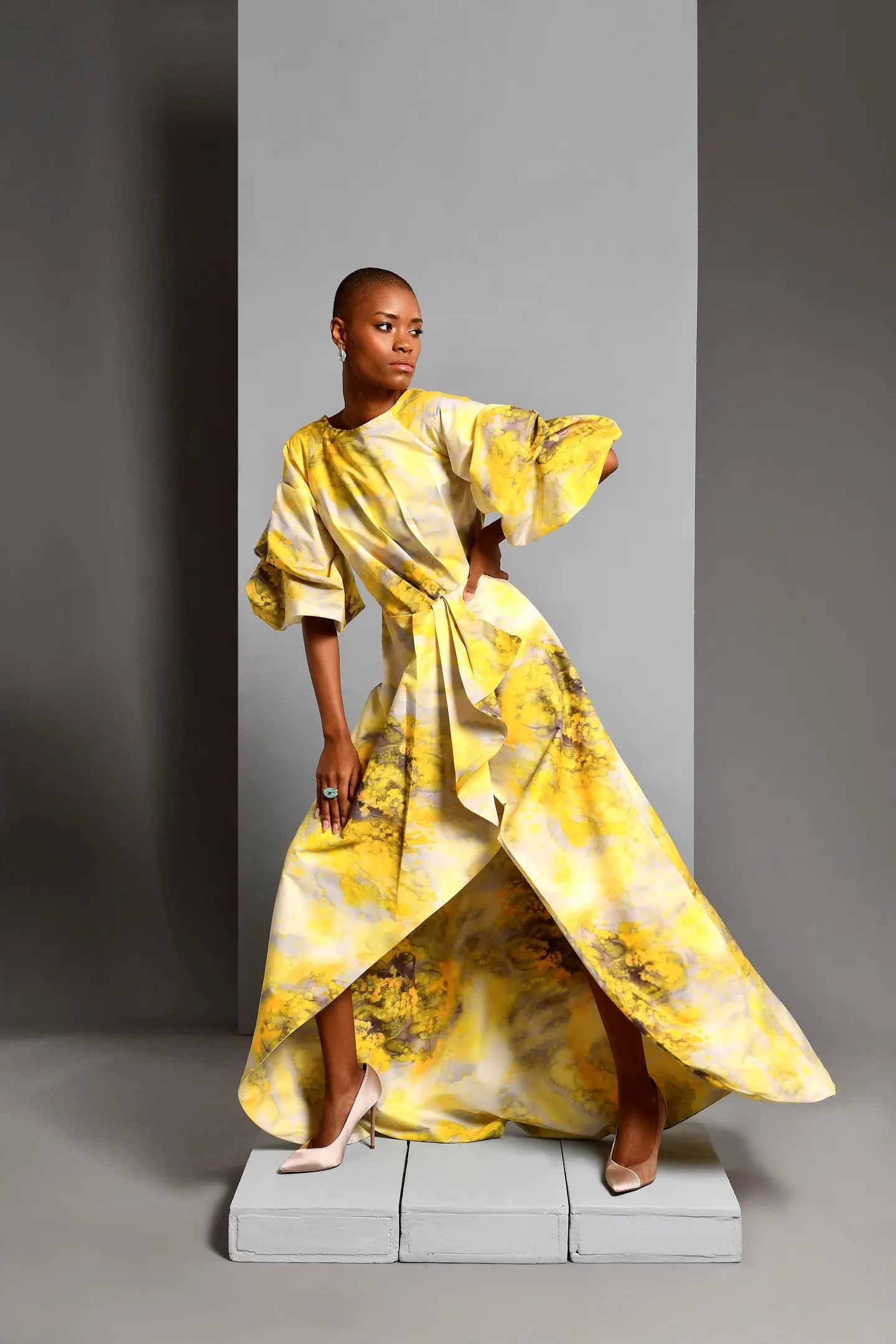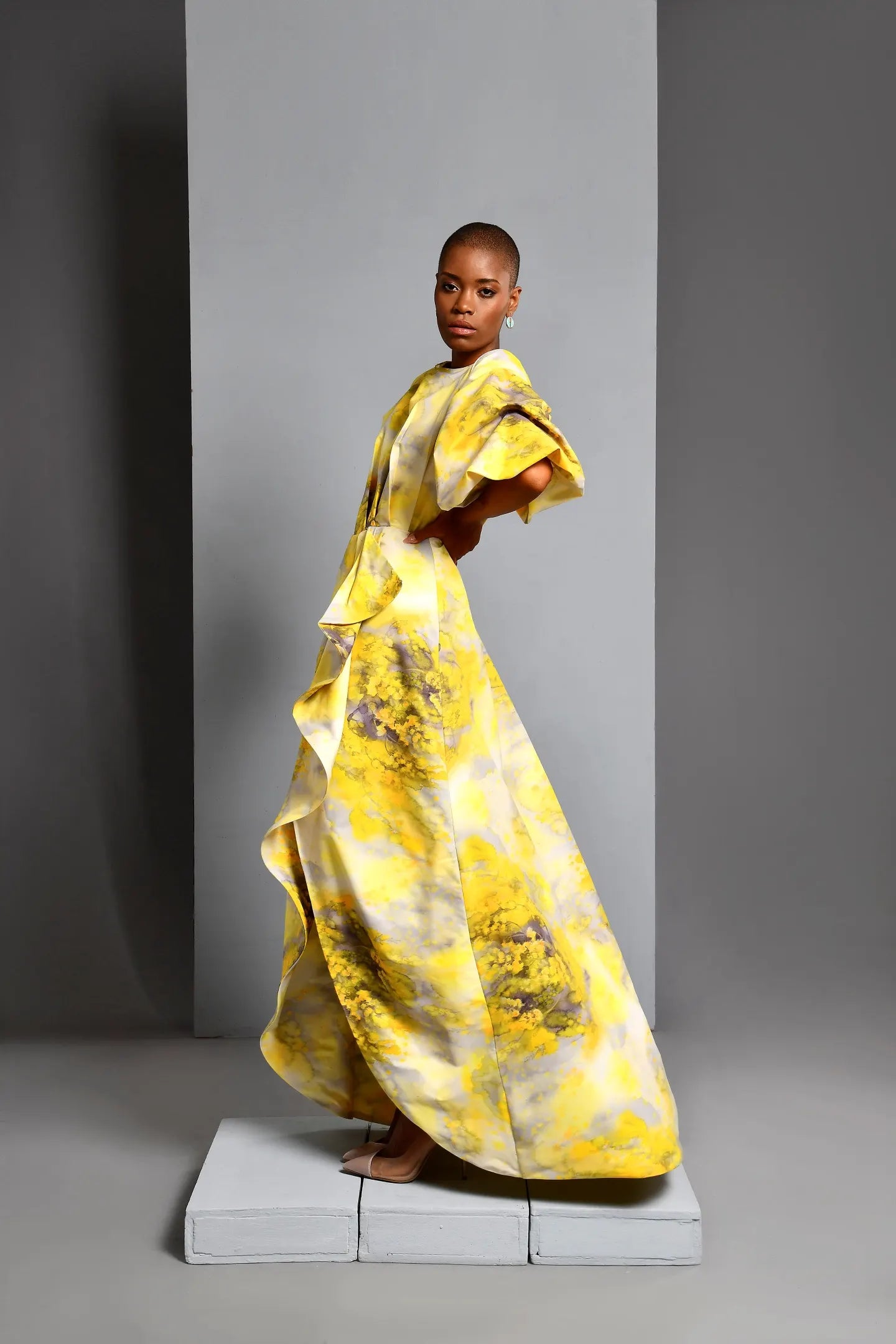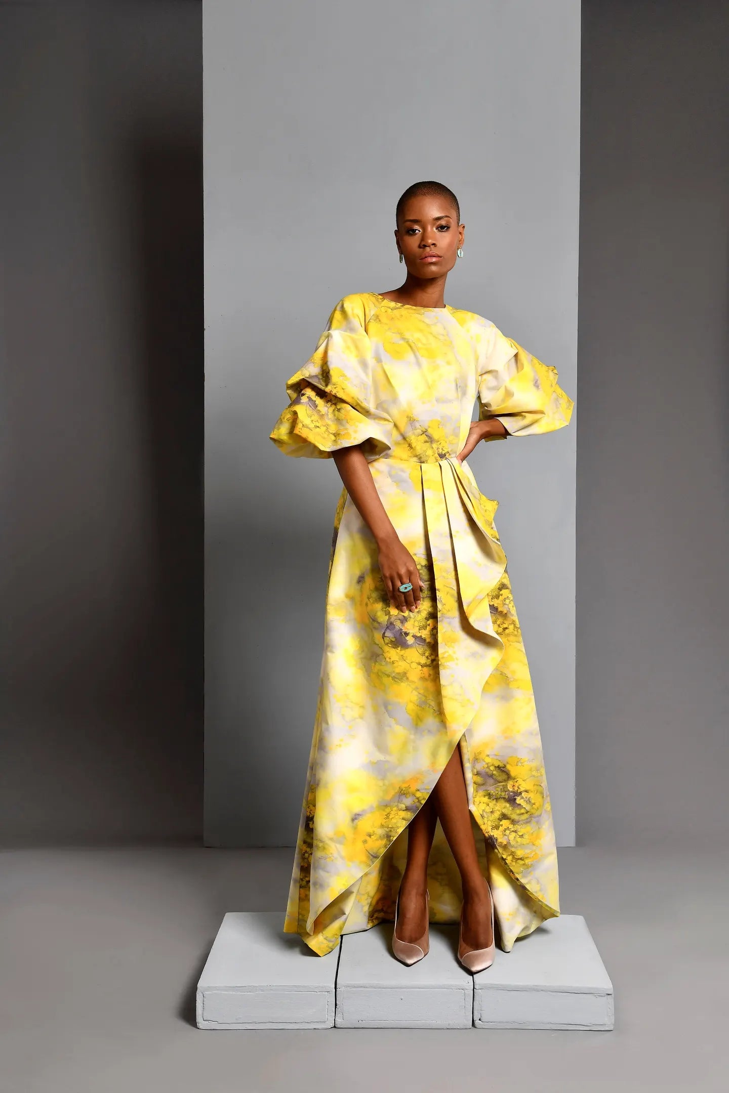 Floral print dress in radiant yellow tones, made from cotton with a satin effect. It features voluminous...