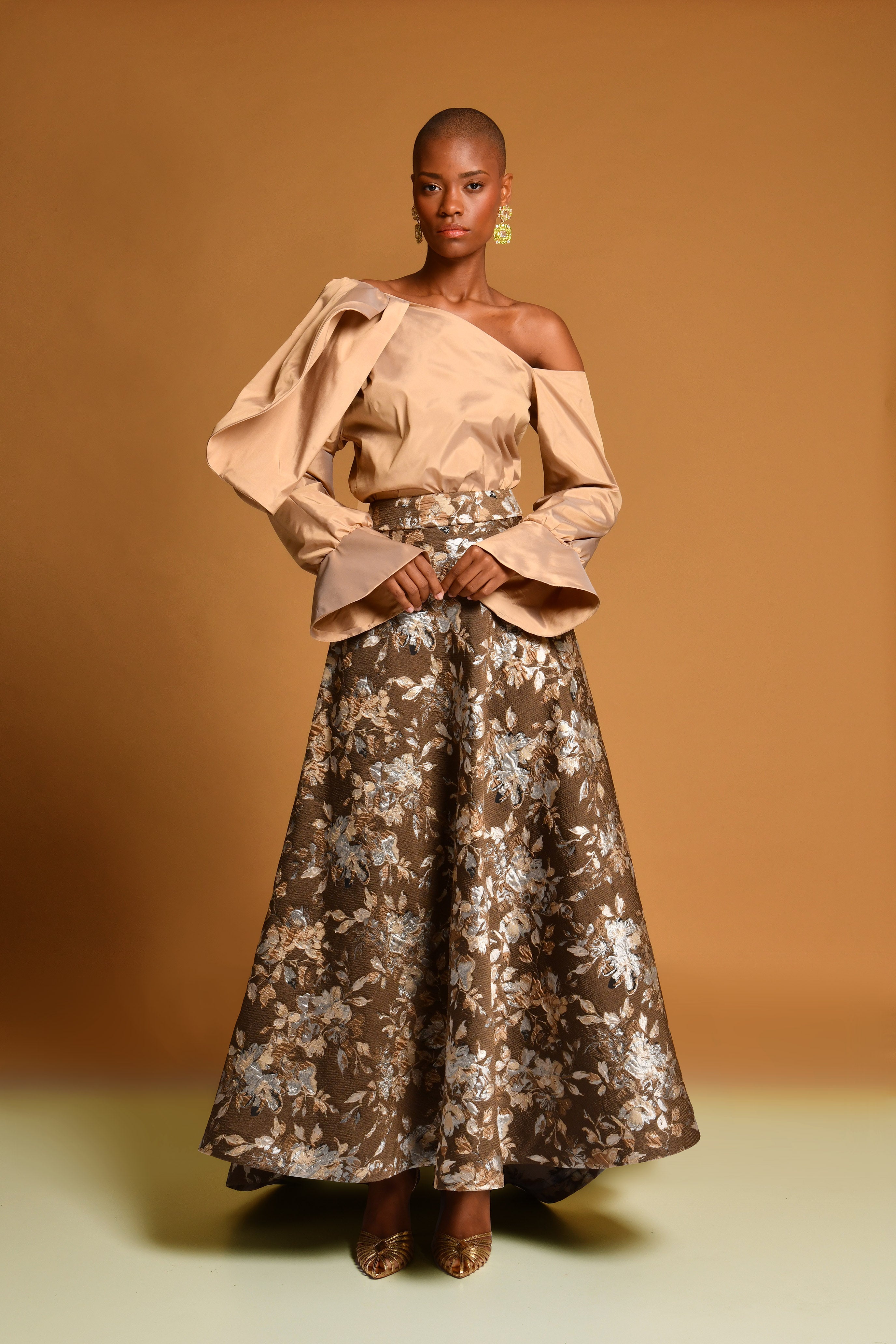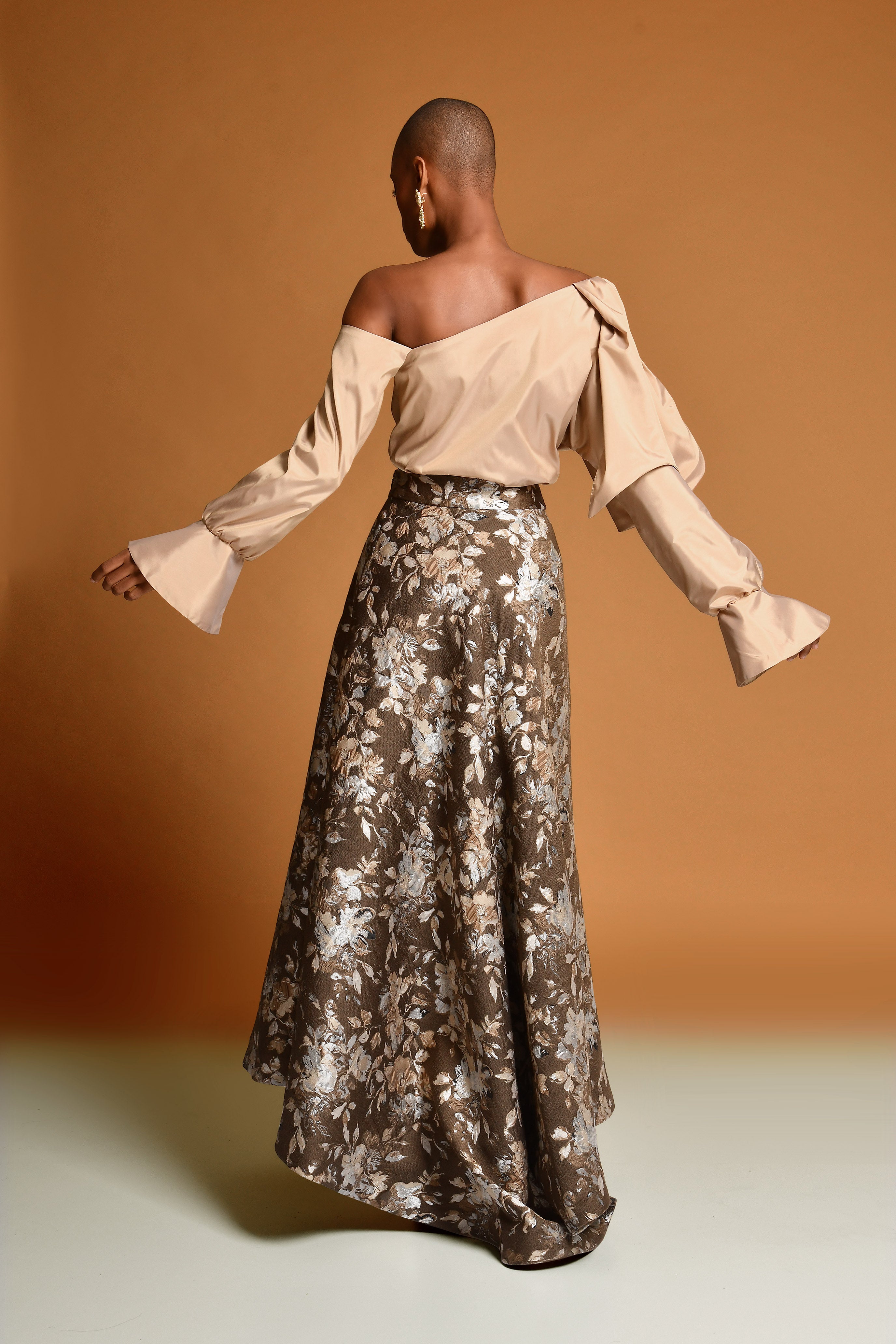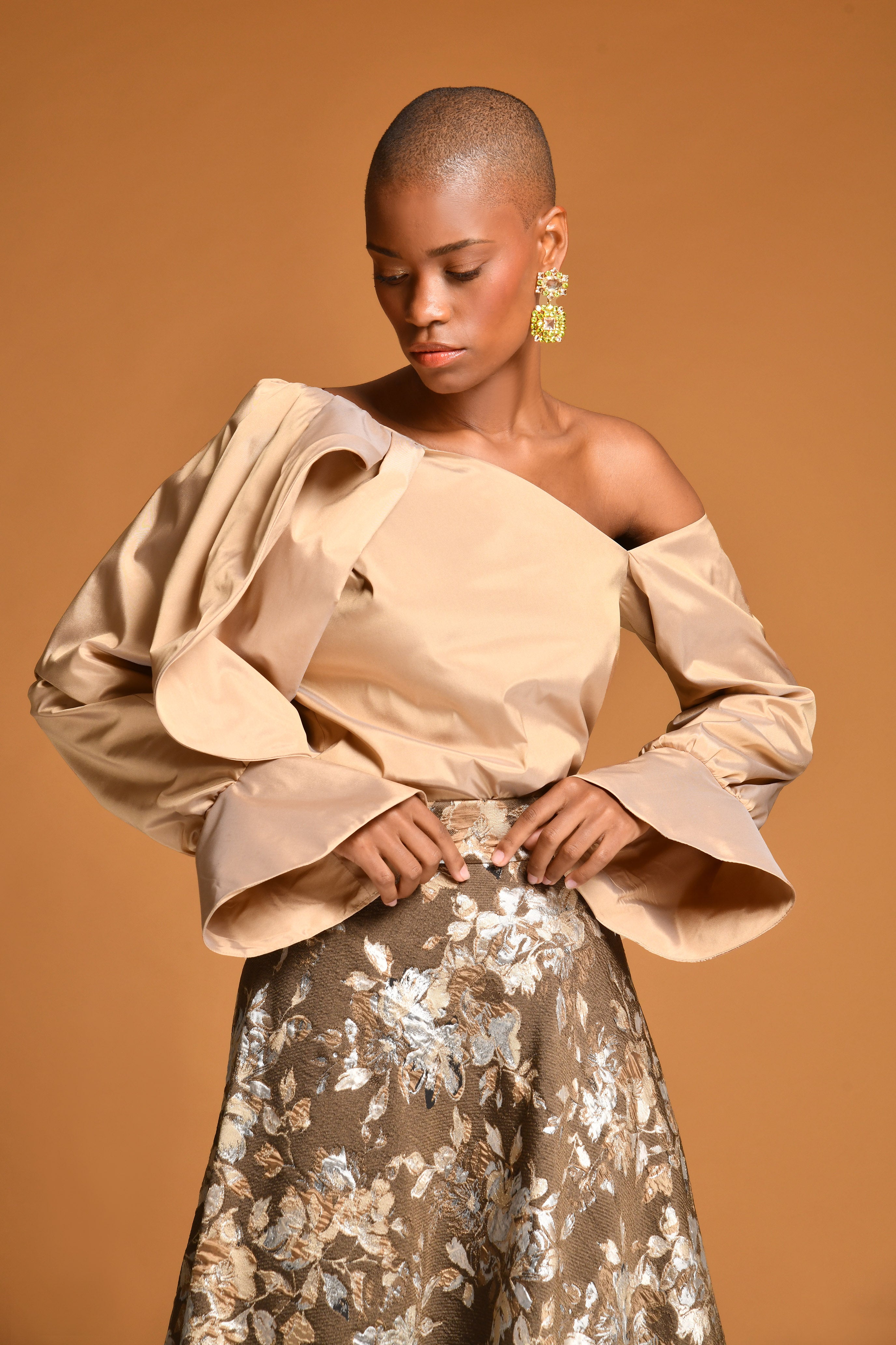 Blusa asimétrica con con manga con volante de gran tamaño y un hombro descubierto. Hecha en tafeta...
