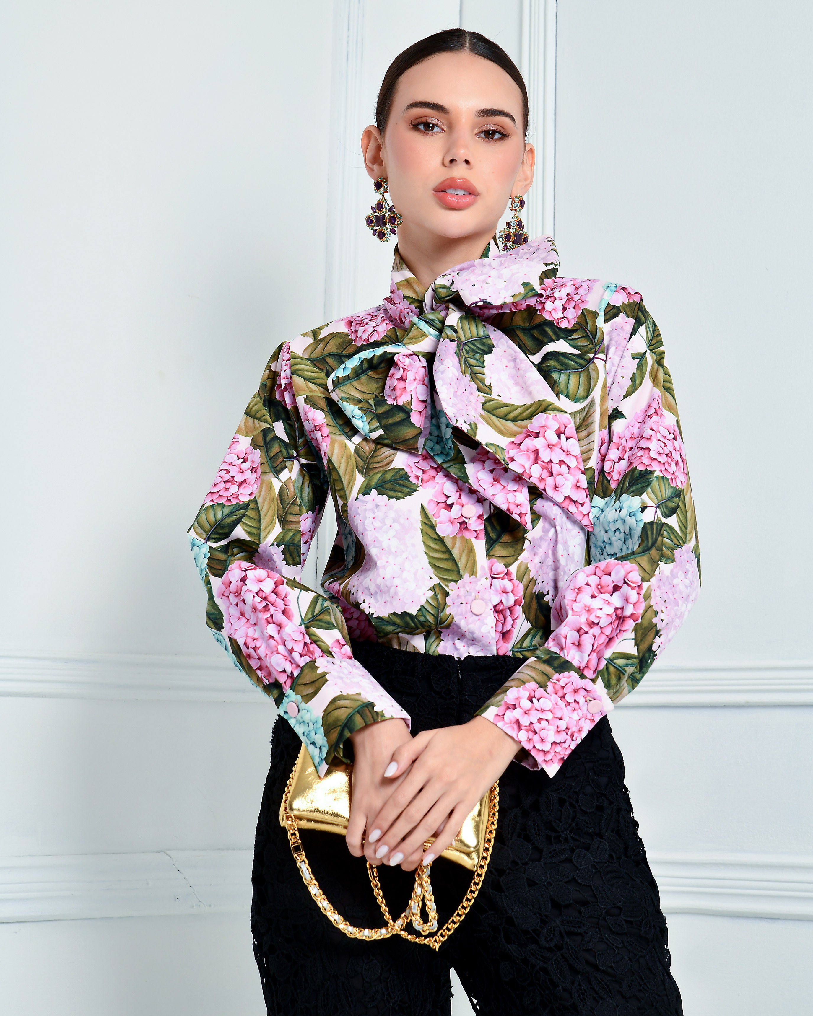 Camisa manga larga englobadas, estampado en flores, cuello con lazo que resalta tu elegancia