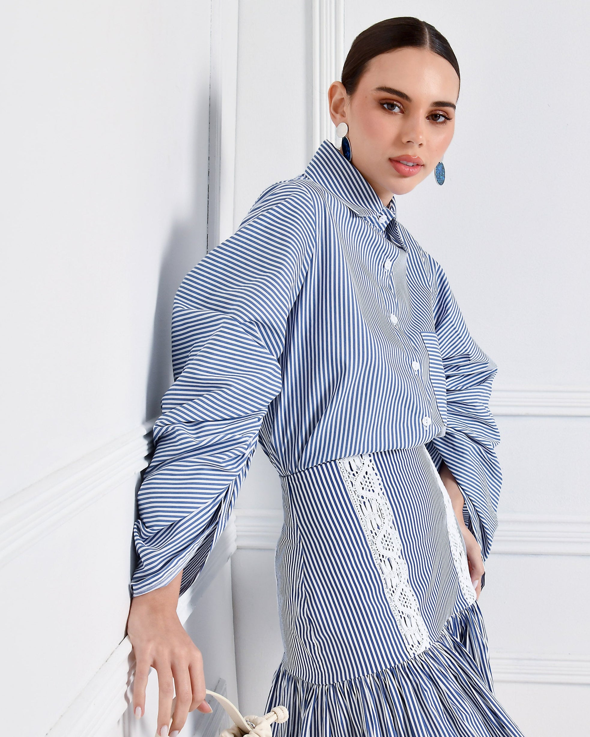 Camisa manga larga de rayas blancas con azul, mangas englobadas