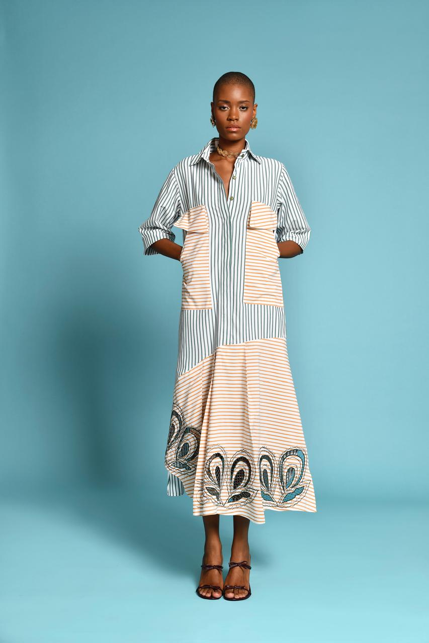 Vestido de corte rectangular con cuello camisero y mangas hasta debajo de los codos con puños sencillos....