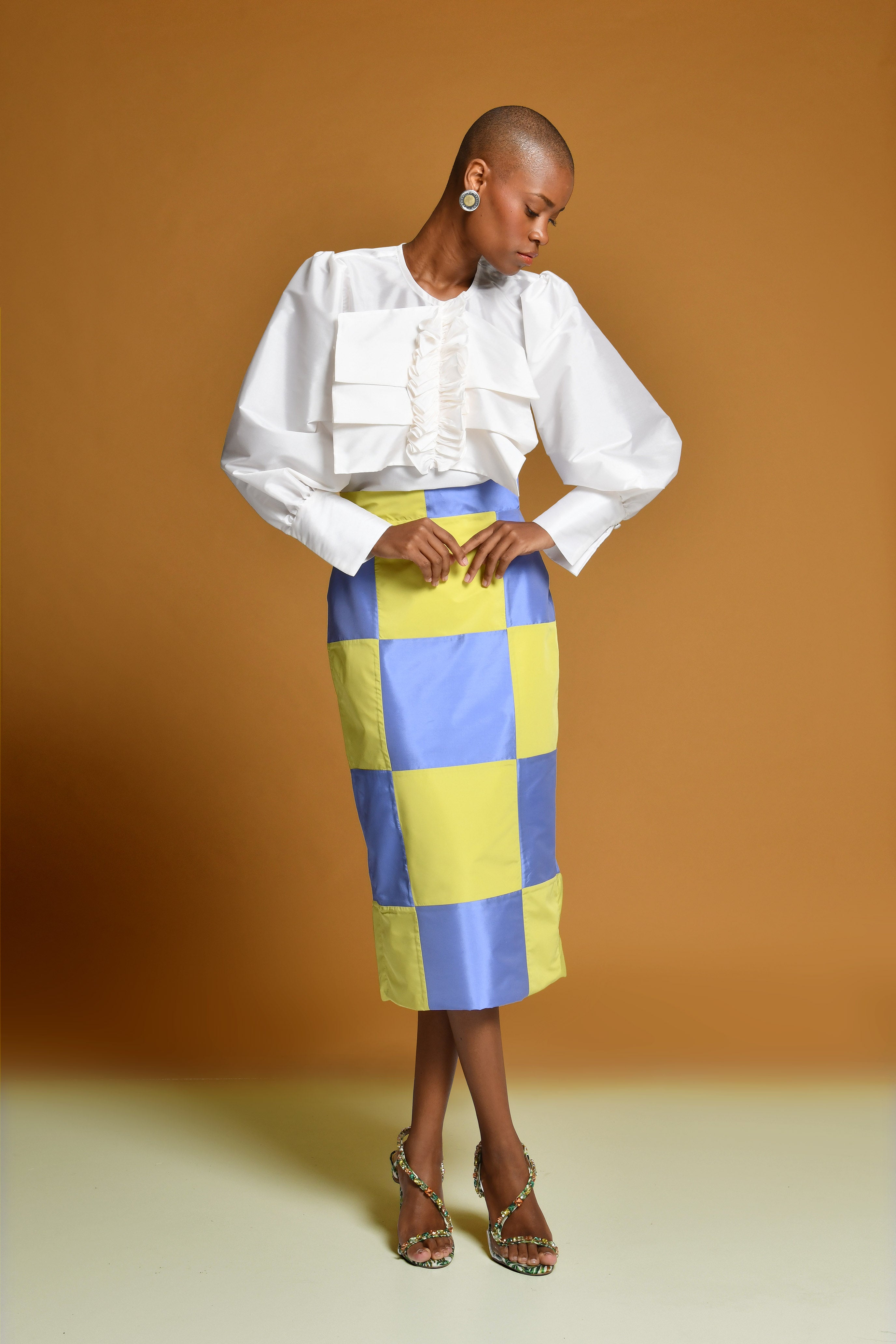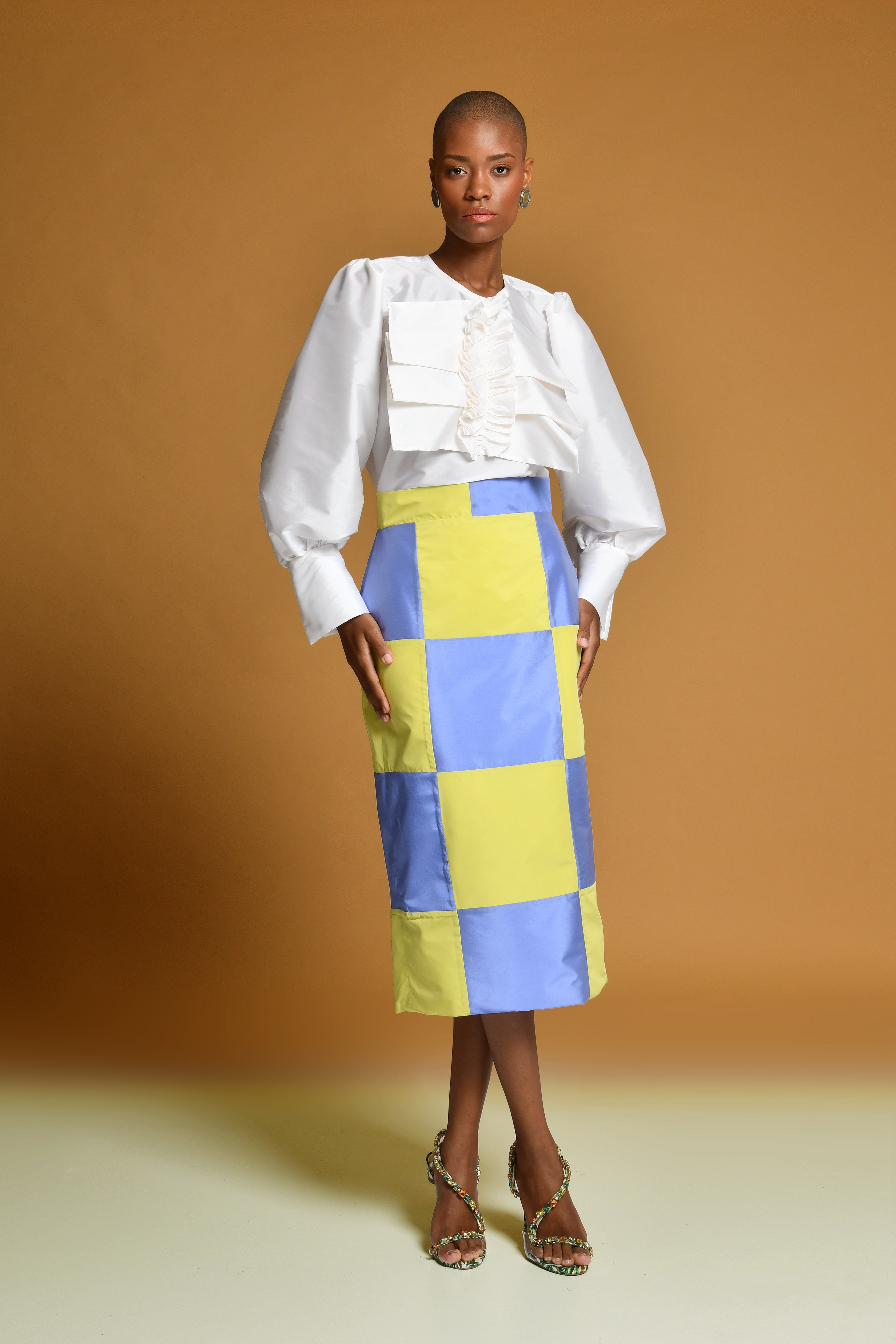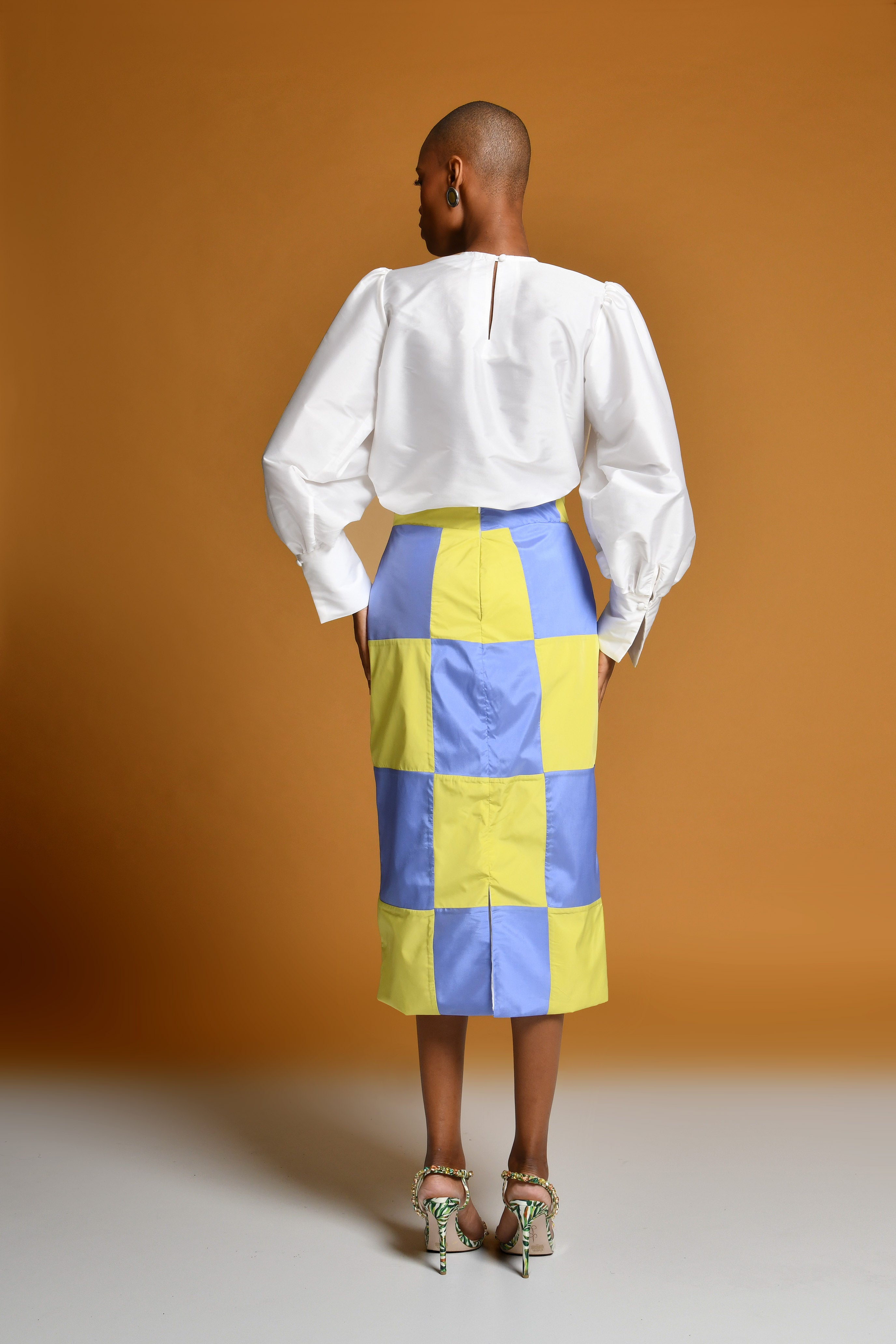 Falda recta largo debajo de la rodilla, está hecha en tafeta de seda.