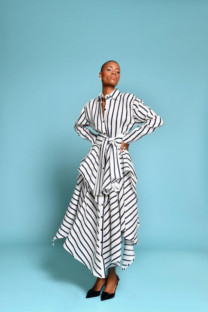 Vestido de rayas con un top de cuello camisero, mangas largas con puños sencillos y un bolsillo...