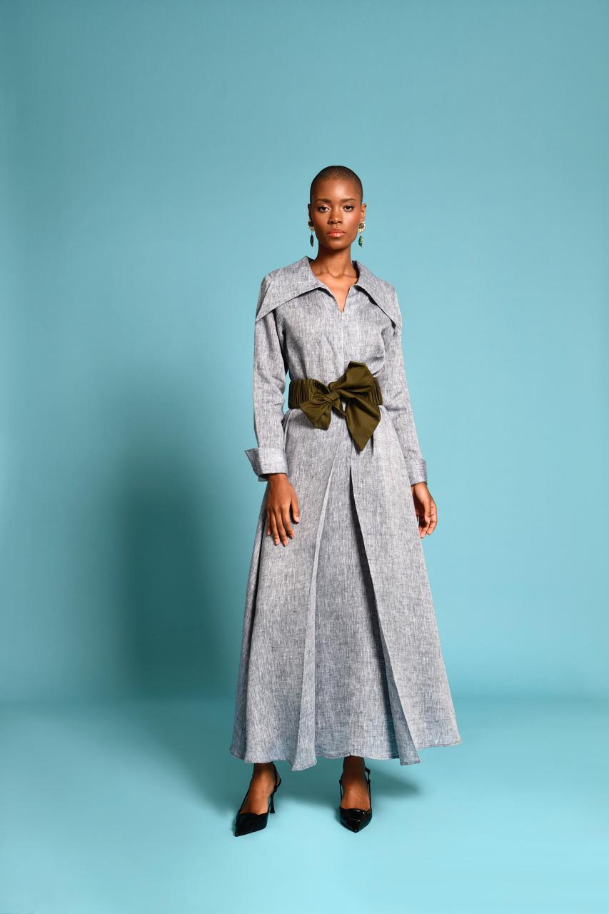 Vestido largo que llega hasta los tobillos, con una parte superior de cuello camisero y pechera invisible...
