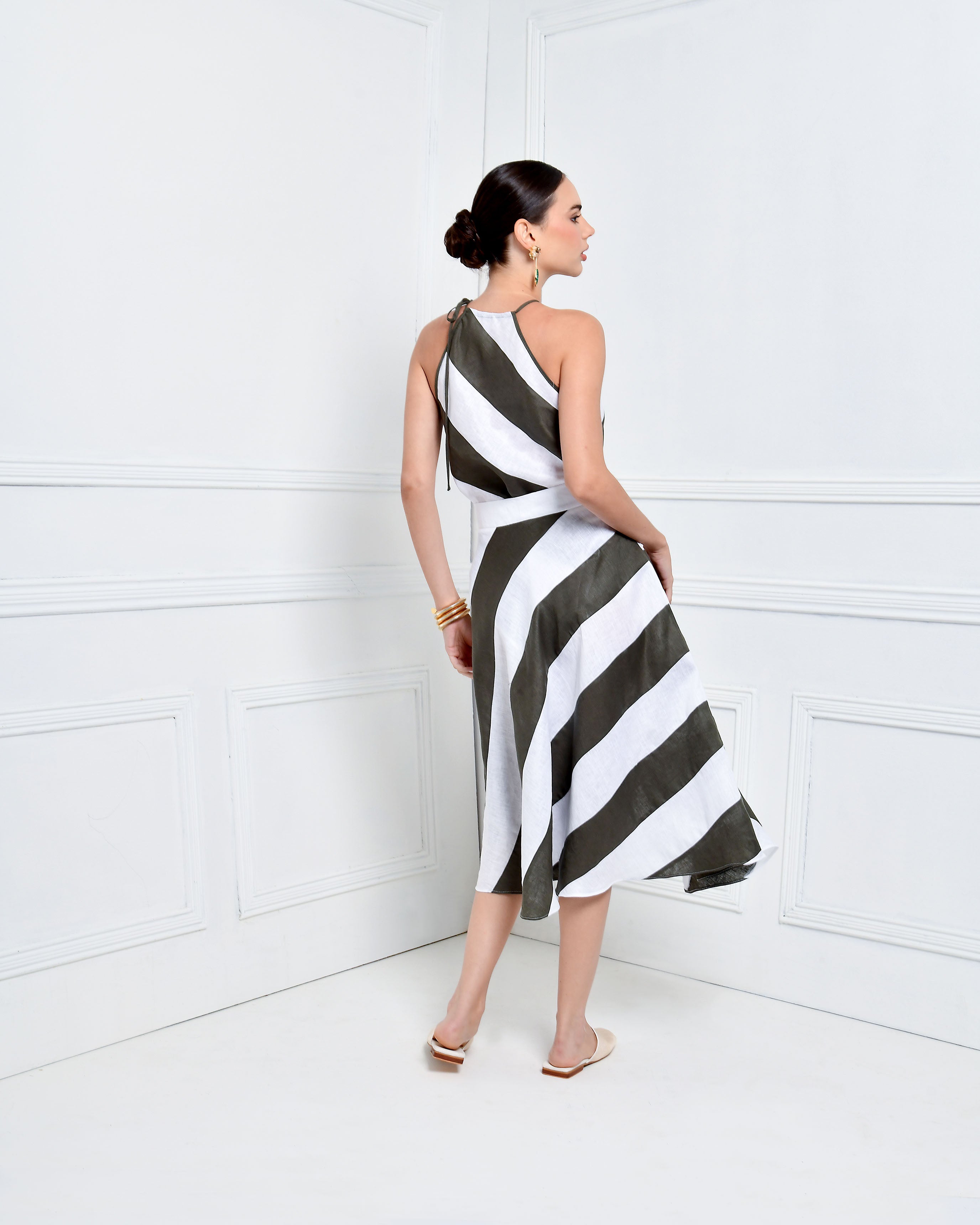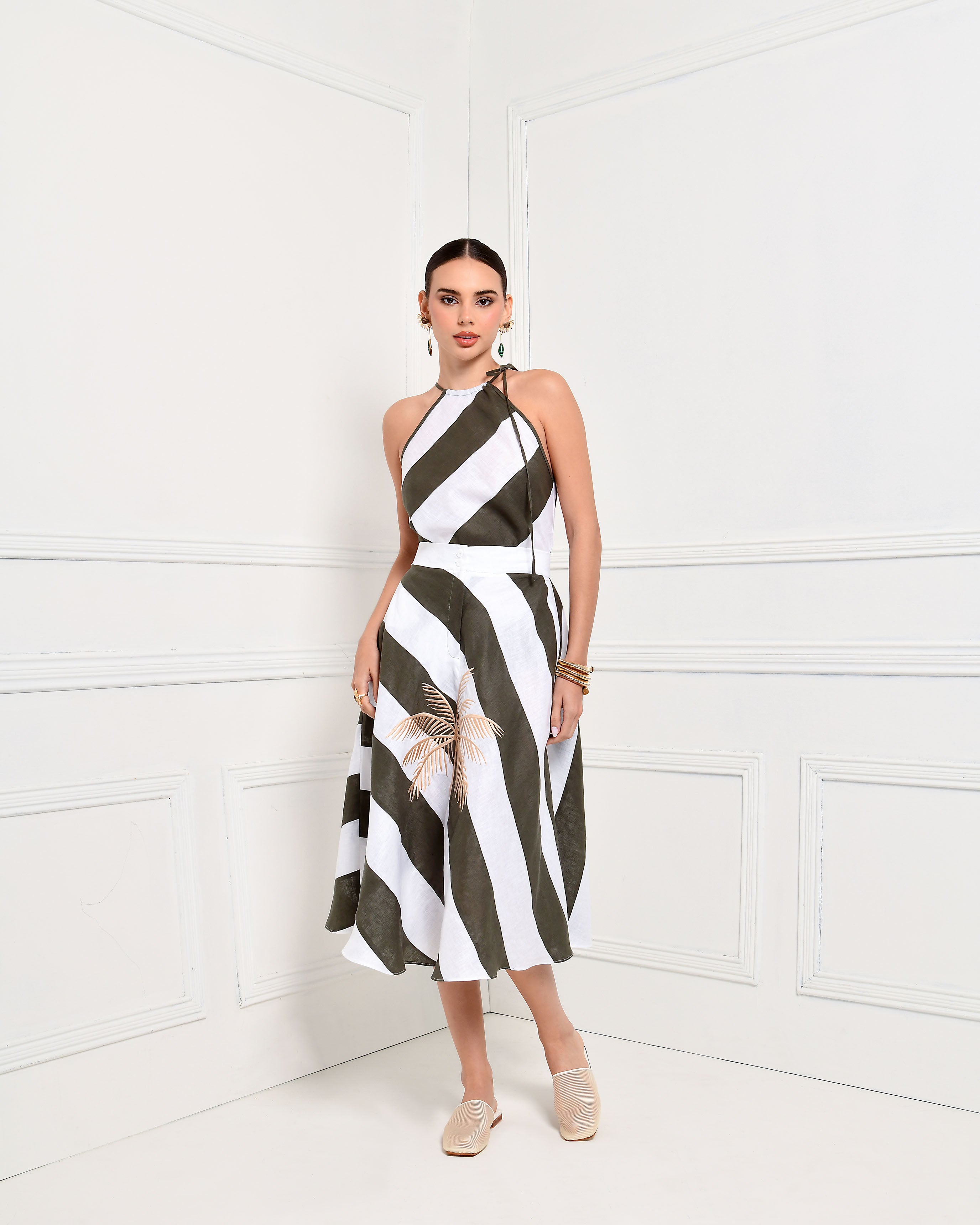 Set confeccionado en lino fresco de rayas verde y blanco. La blusa sin mangas aporta un toque...