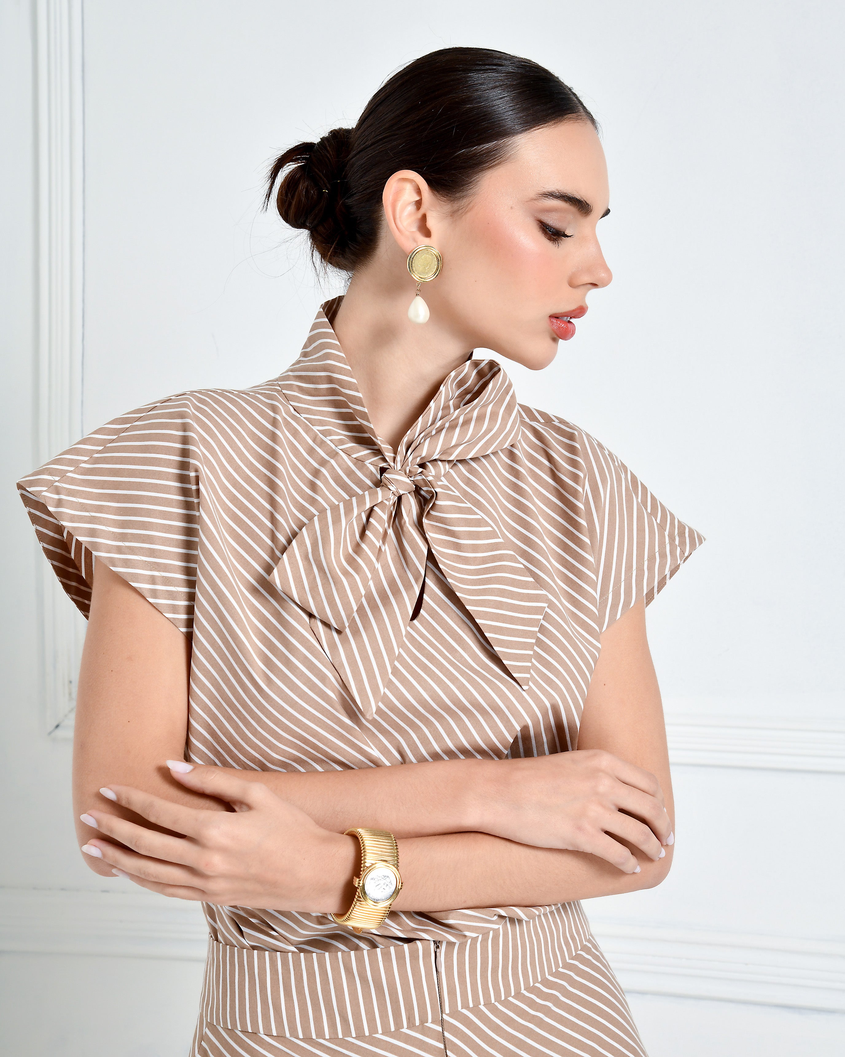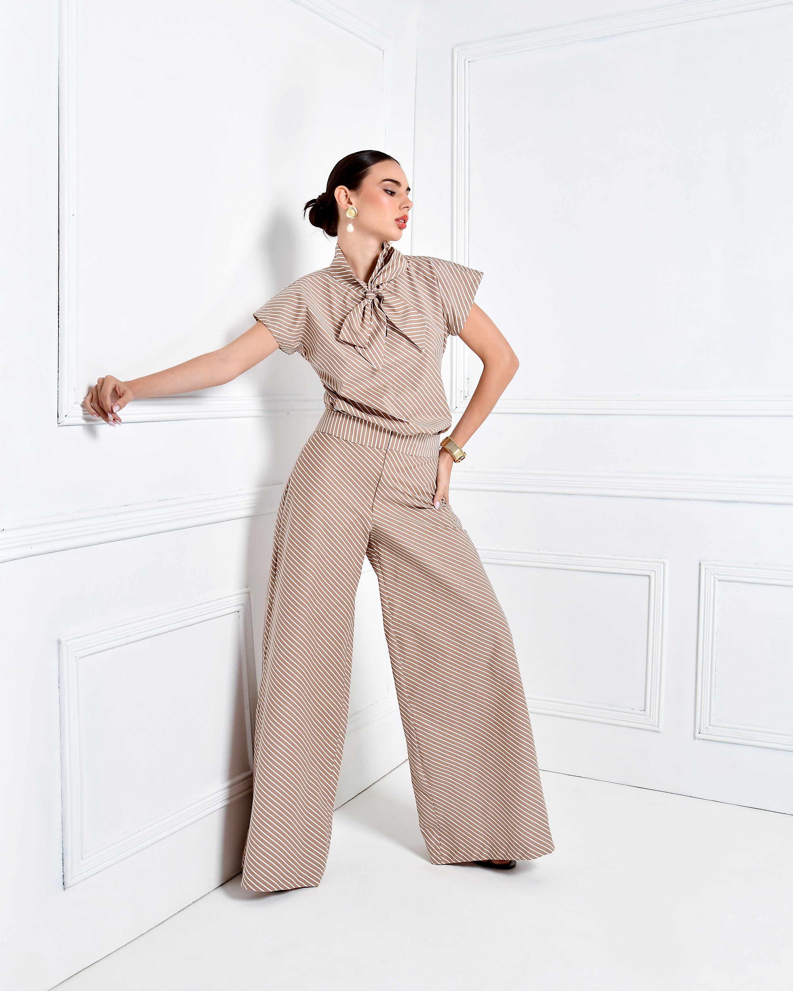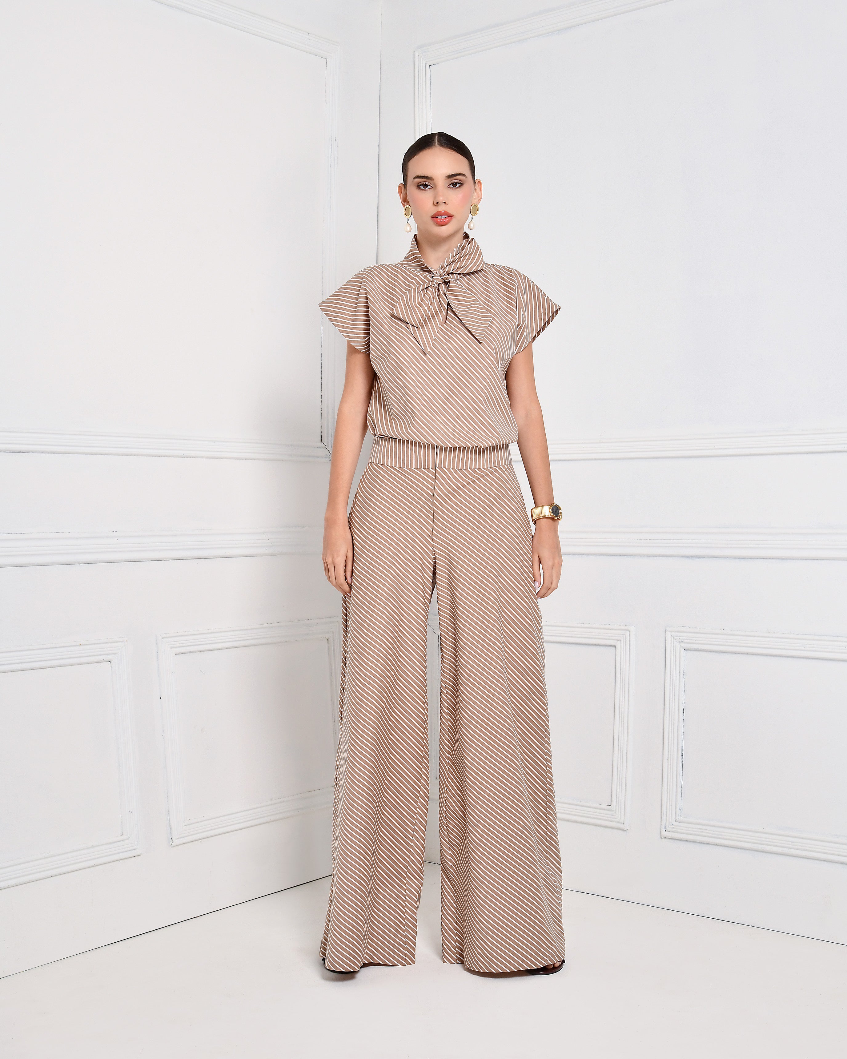 PANTALON ELEFANTE CON CREMALLERAS DELANTERO, BLUSA MANGA CORTA CON NUDO EN EL CUELLO.