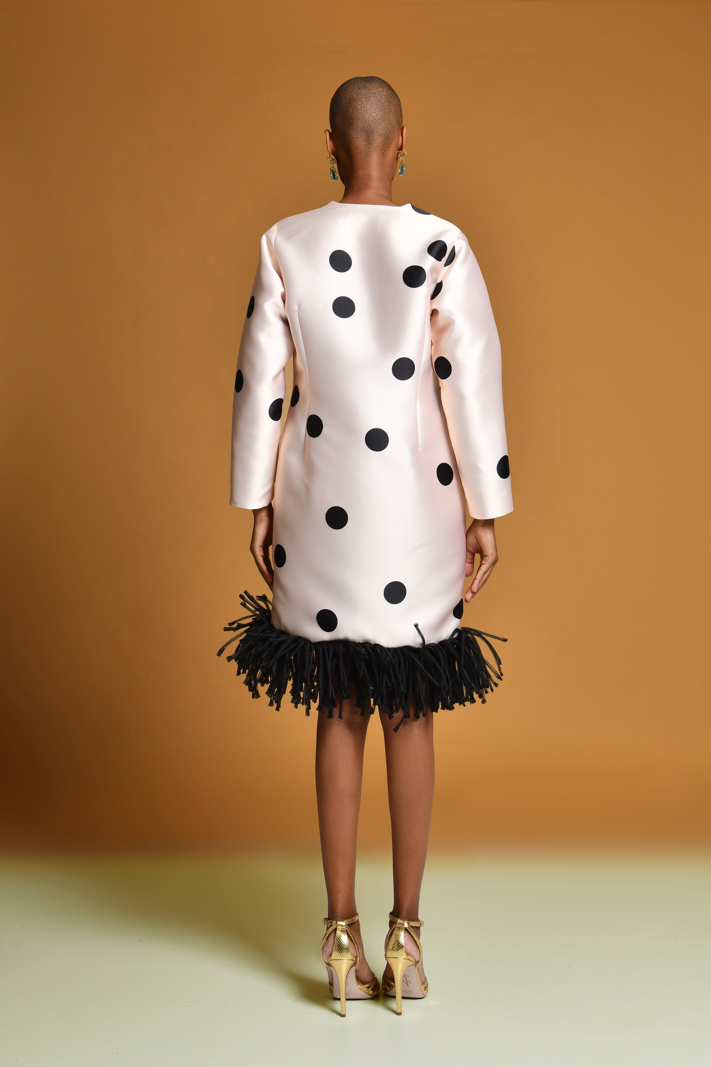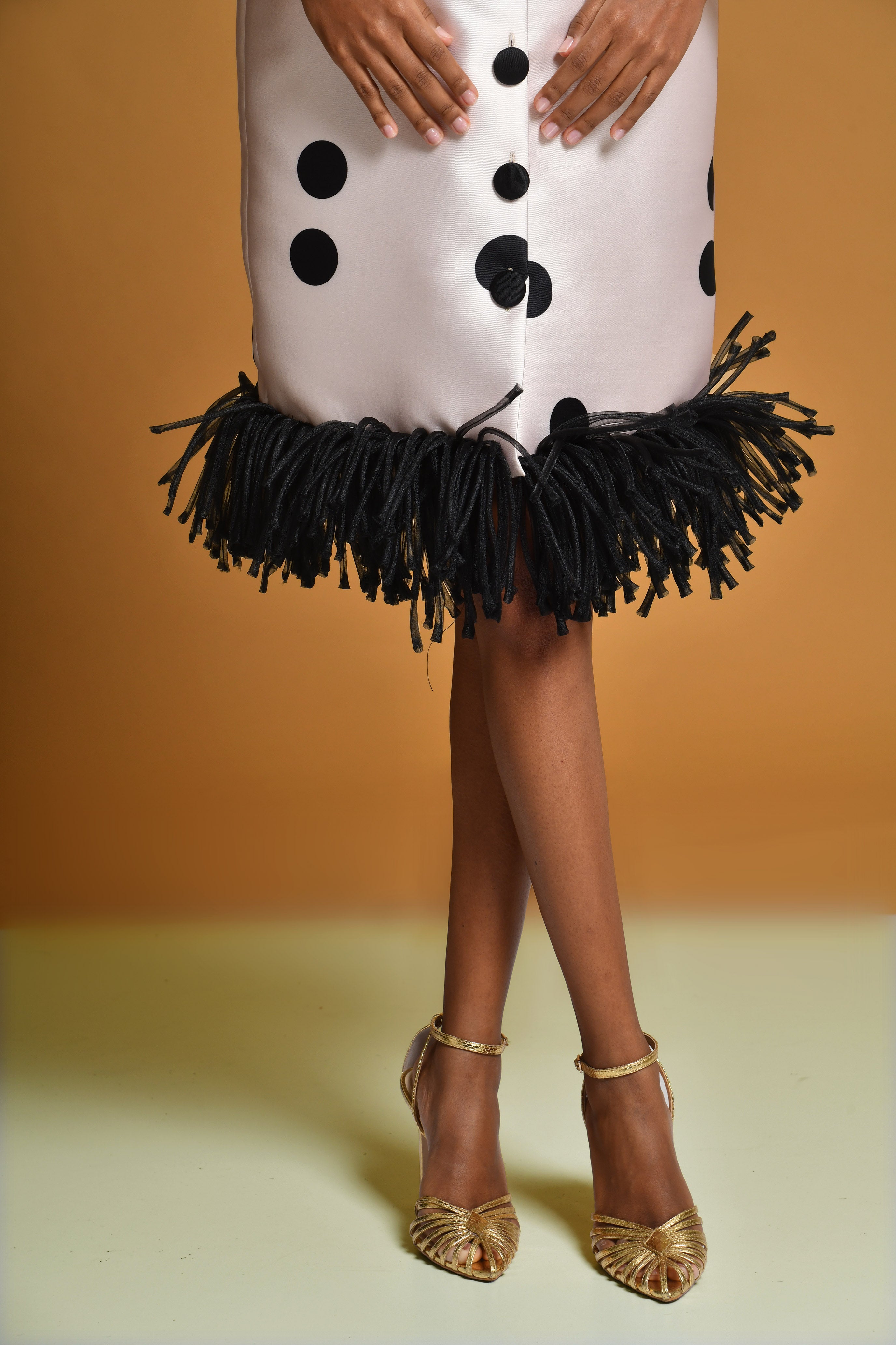 Vestido con escote pronunciado, apliques tipo pitillo en el ruedo.