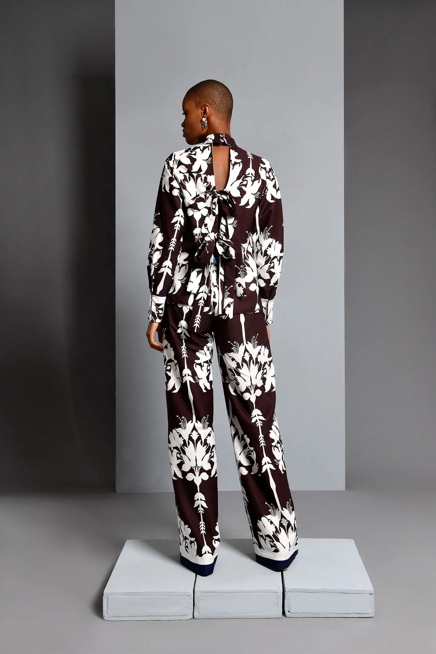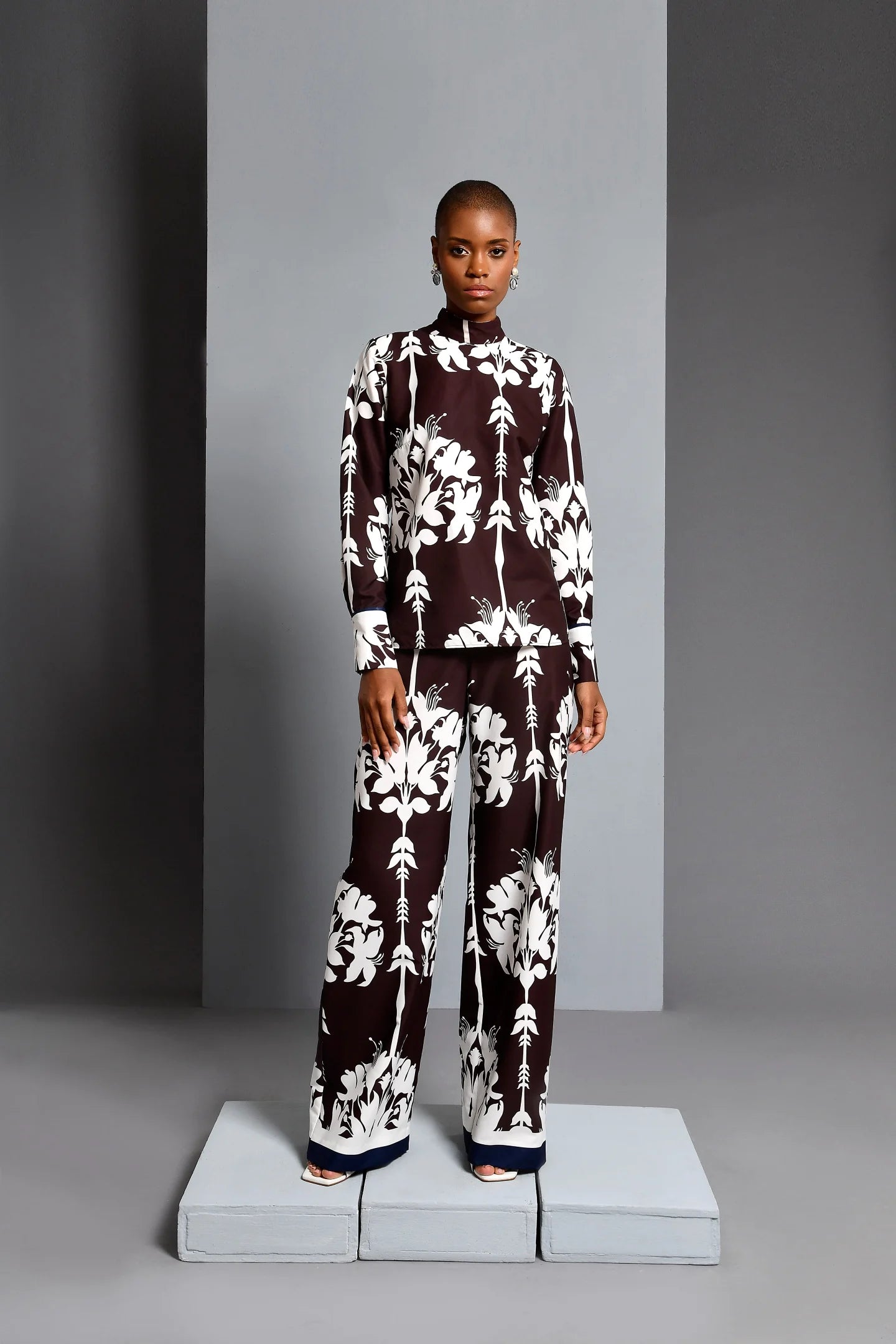 Conjunto en drill estampado de plantas blancas sobre un fondo marrón oscuro. La blusa presenta un elegante...