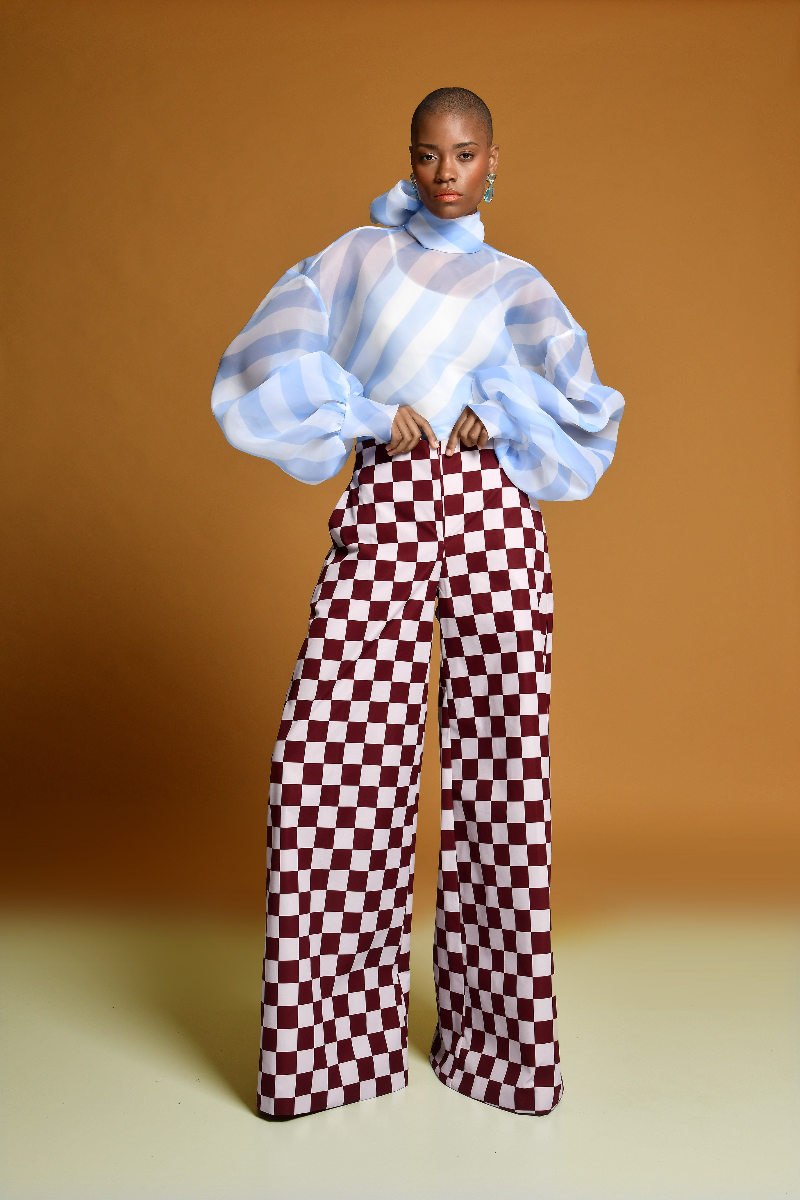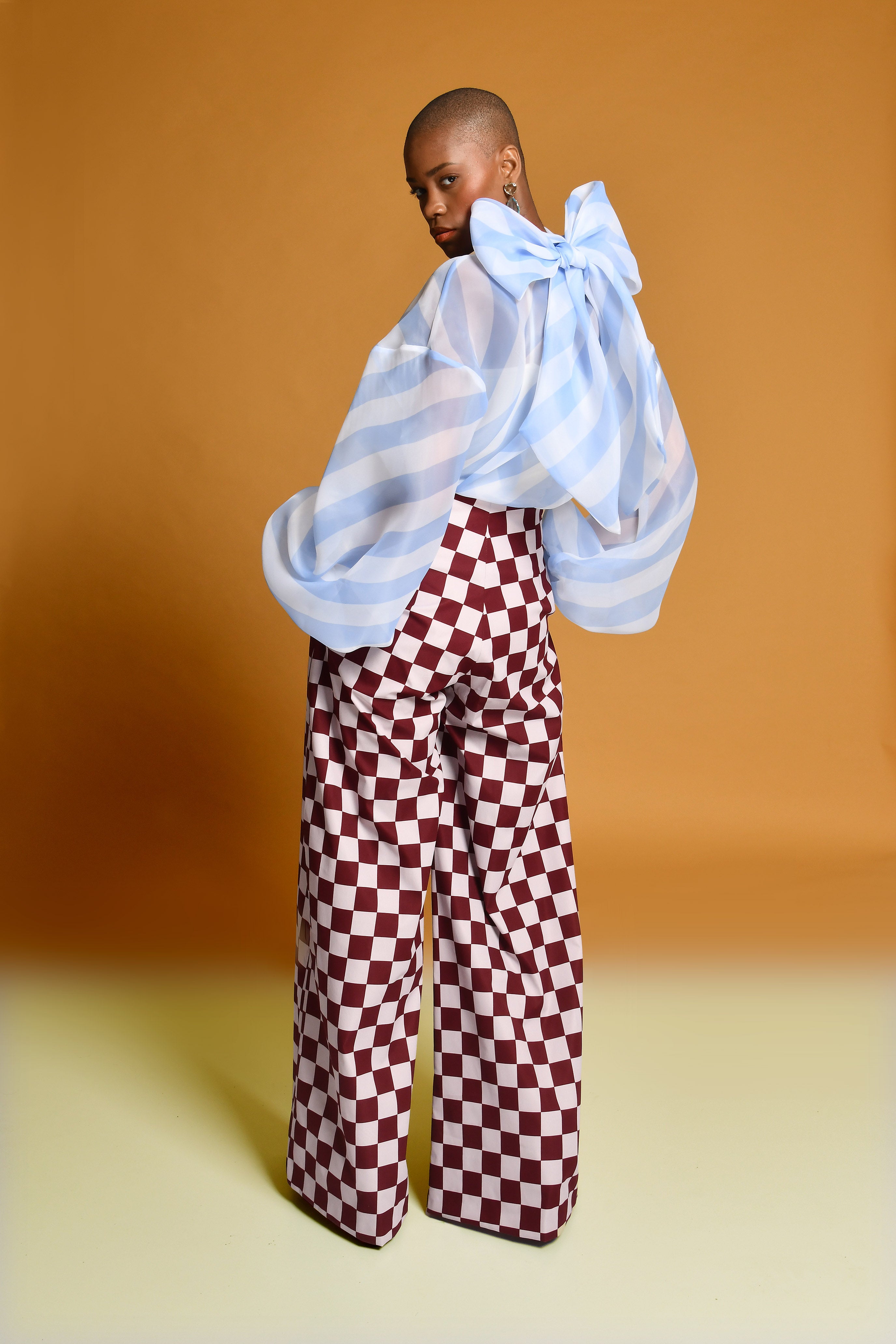 Blusa manga globo con puño, cuello tipo lazo que se forma en la parte de posterior.