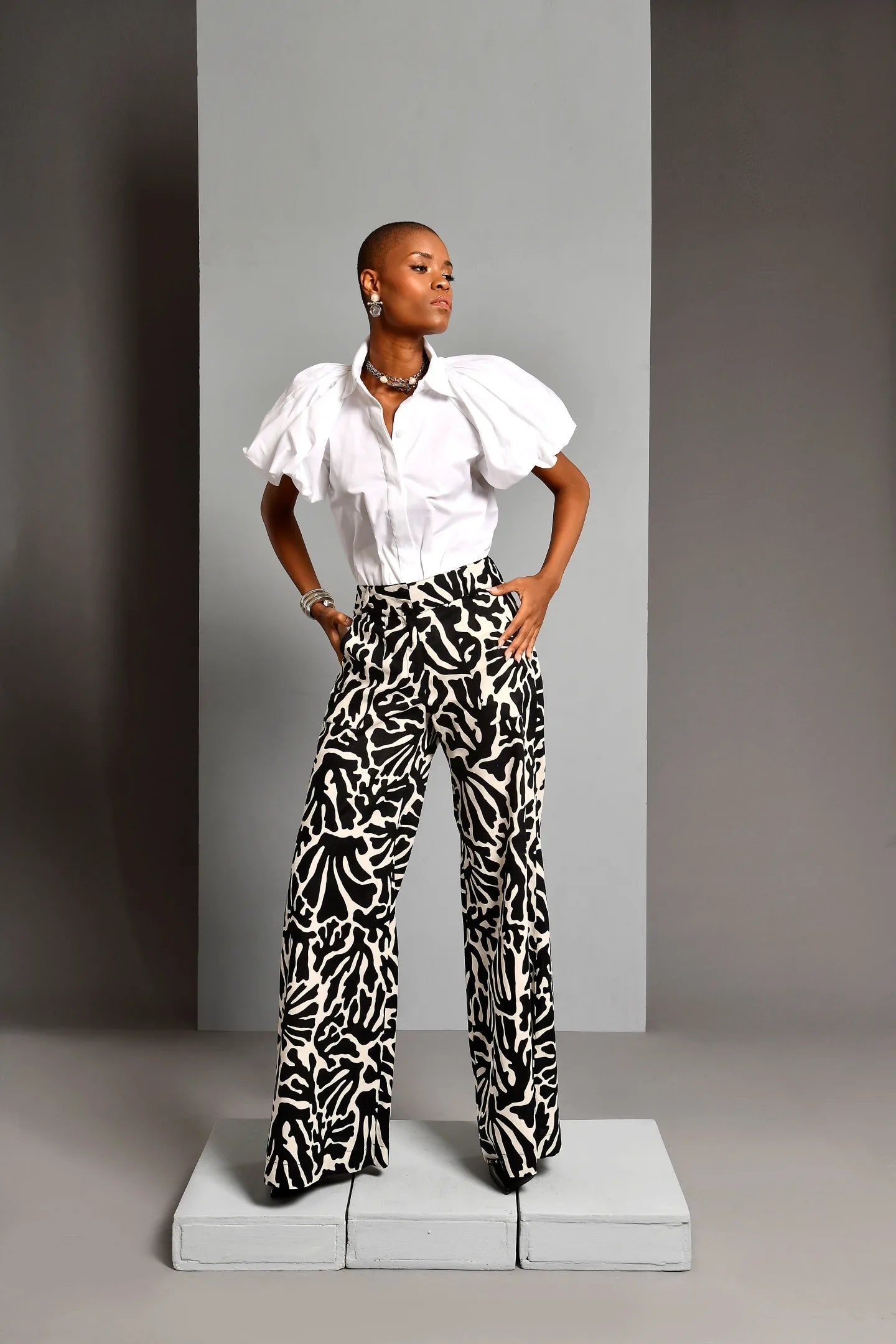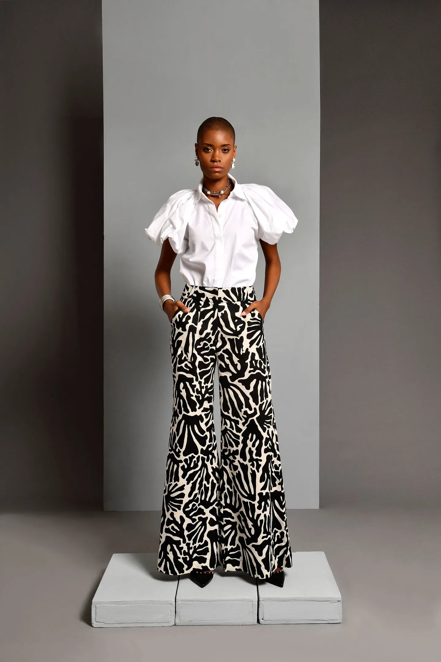 Pantalón en olan de hilo con estampado de algas marinas en negro sobre un fondo beige. Presenta...