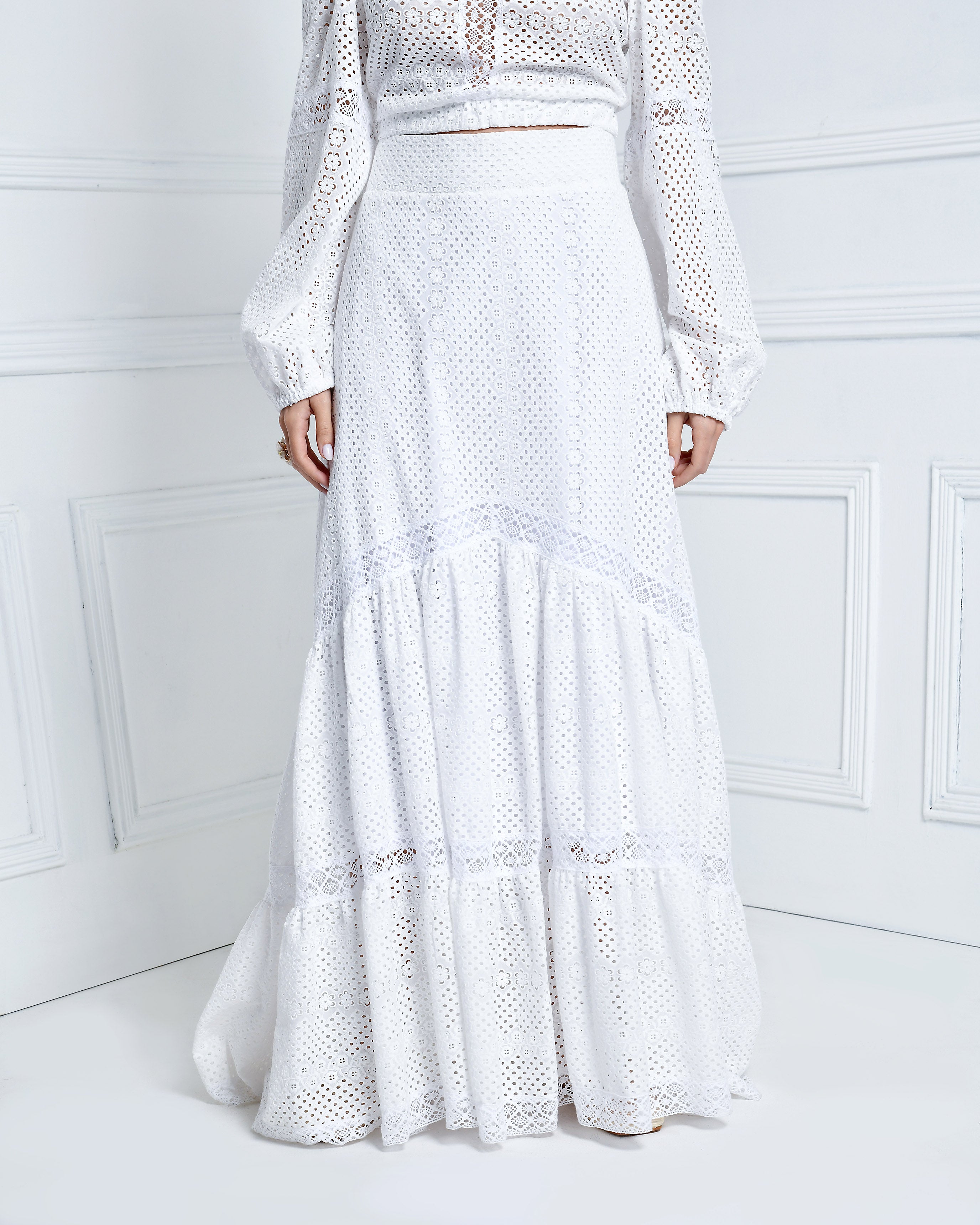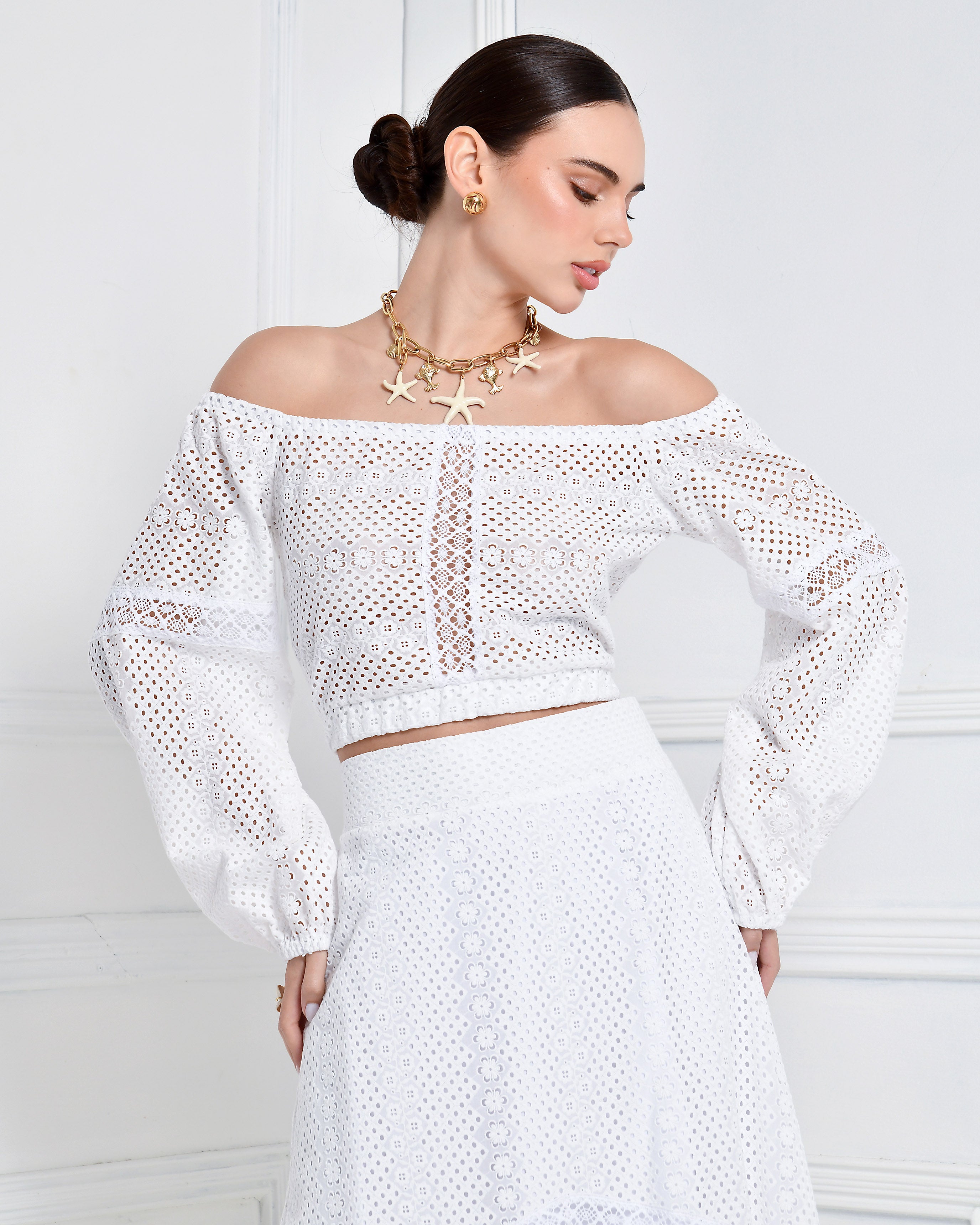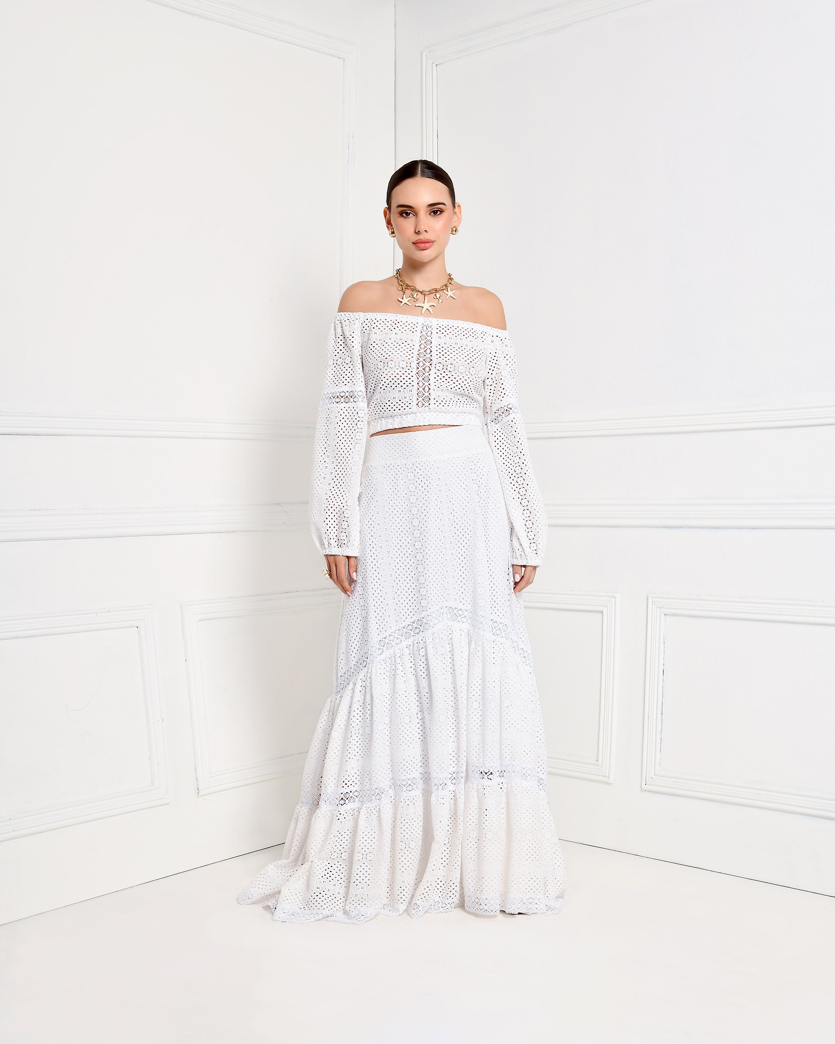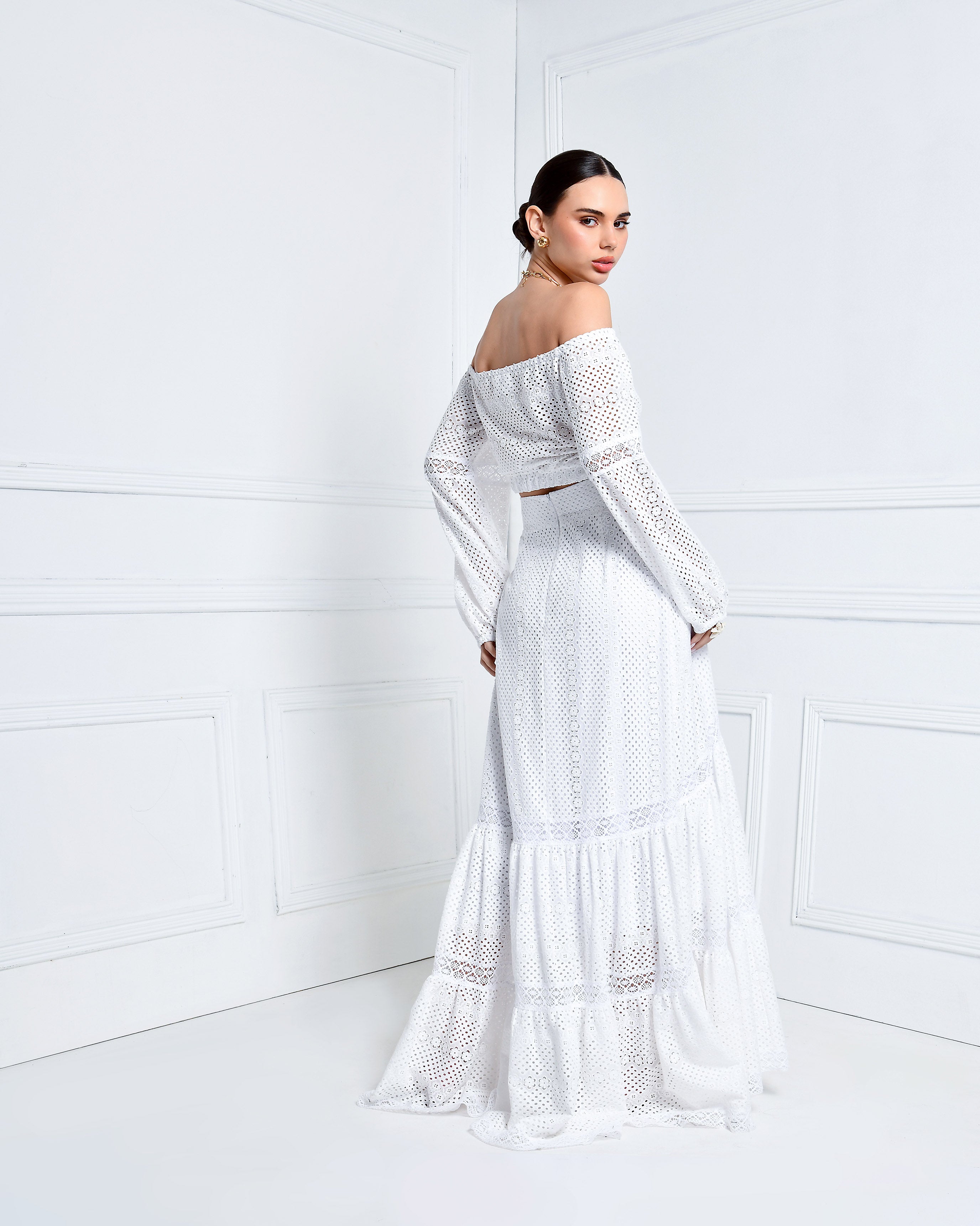 Set en ojalillo con blusa escote bandeja, manga larga, falda rotonda con cortes