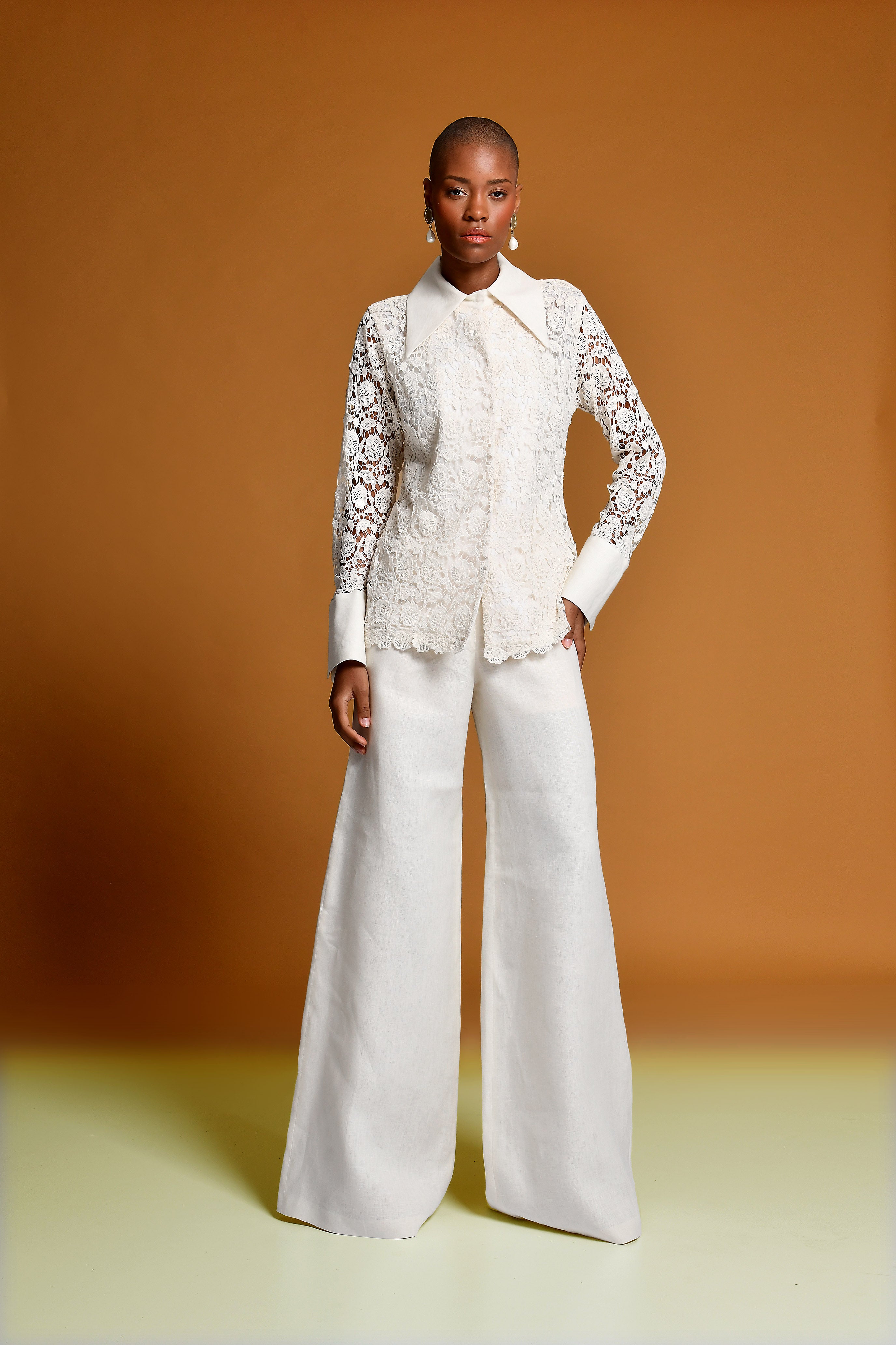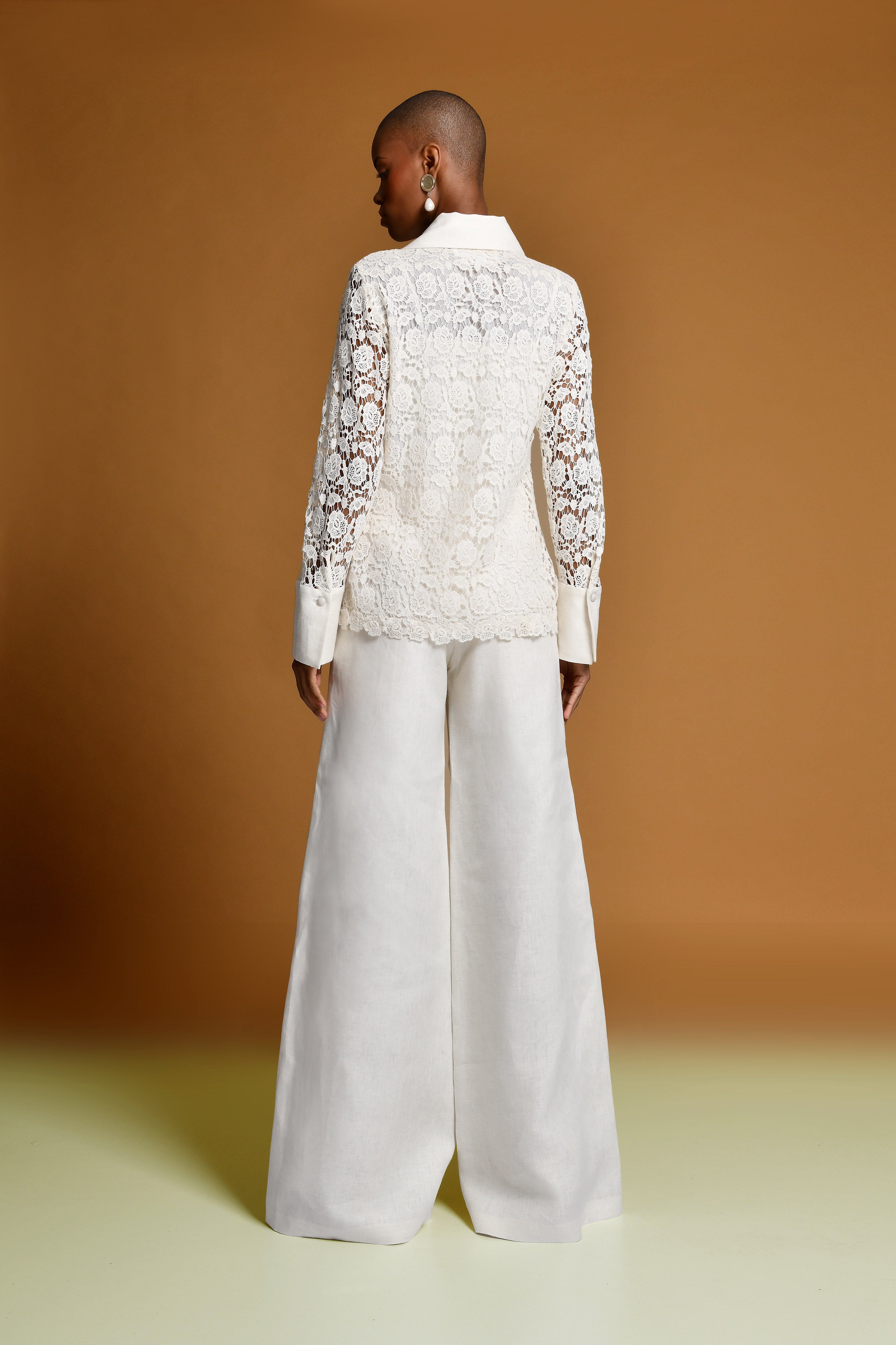 Set de camisa hecha en encajes con detalles de puño en lino, pantalon de lino 100%.