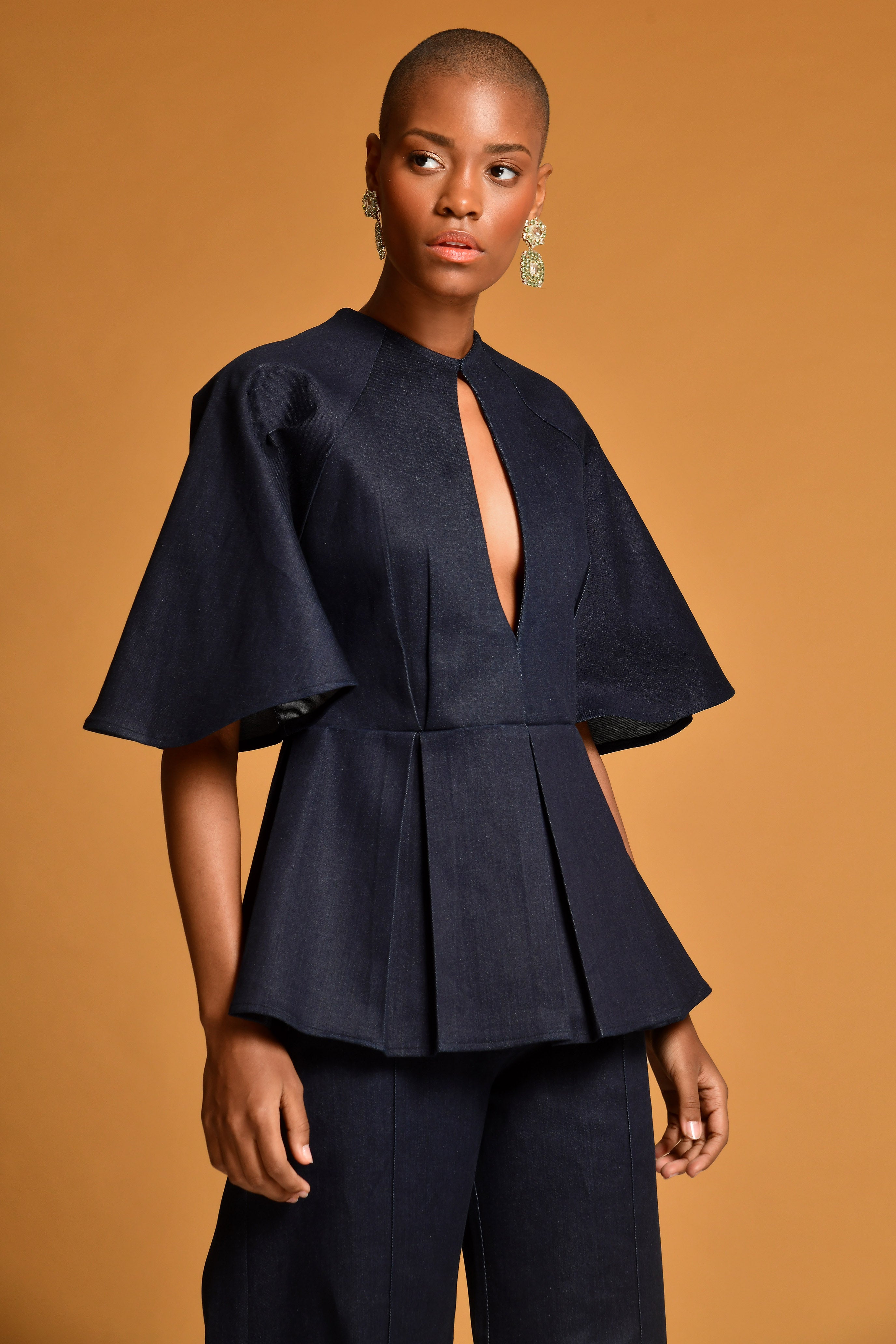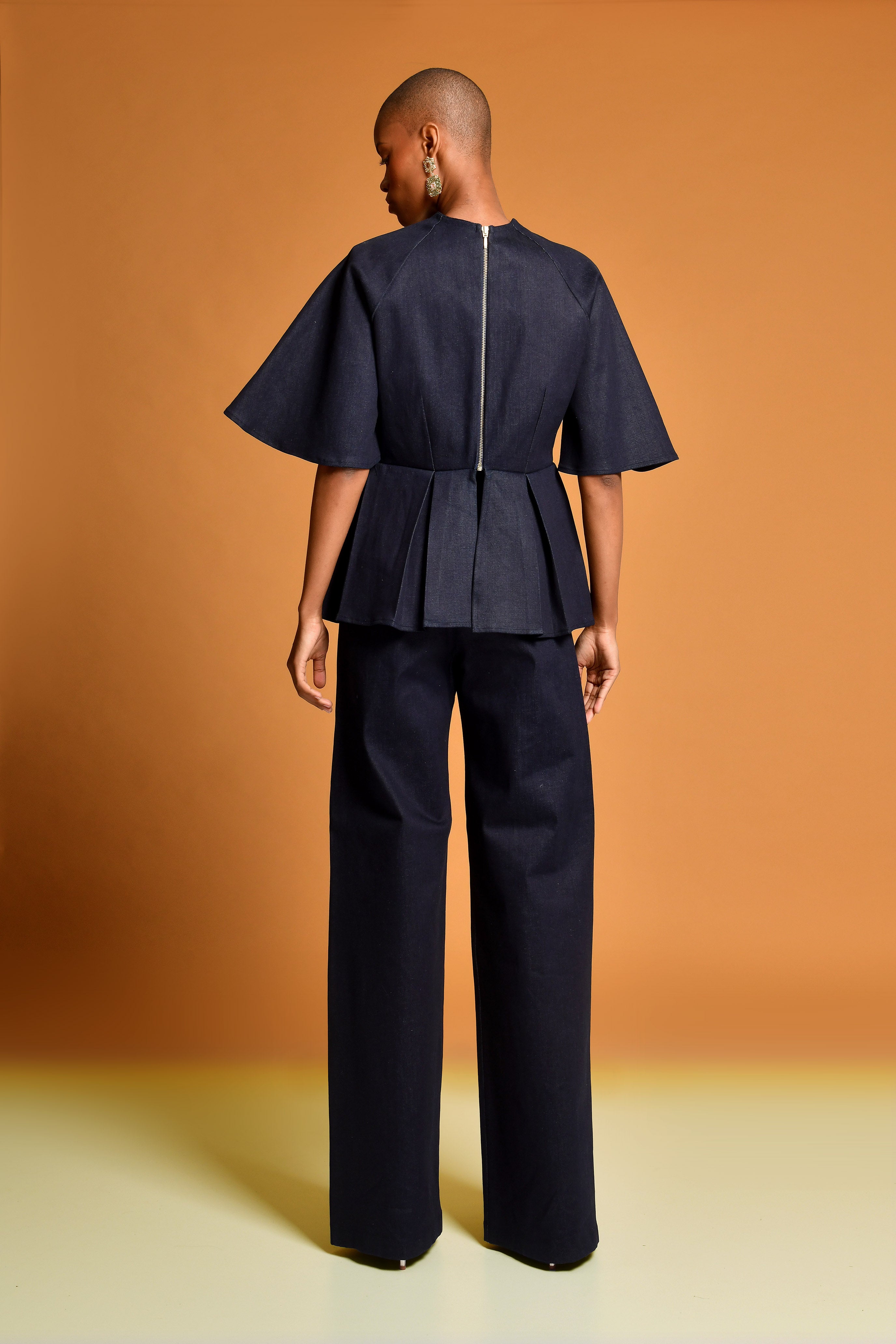 blusa con mangas amplias con escote profundo y marcado en cintura, con pantalón recto ancho