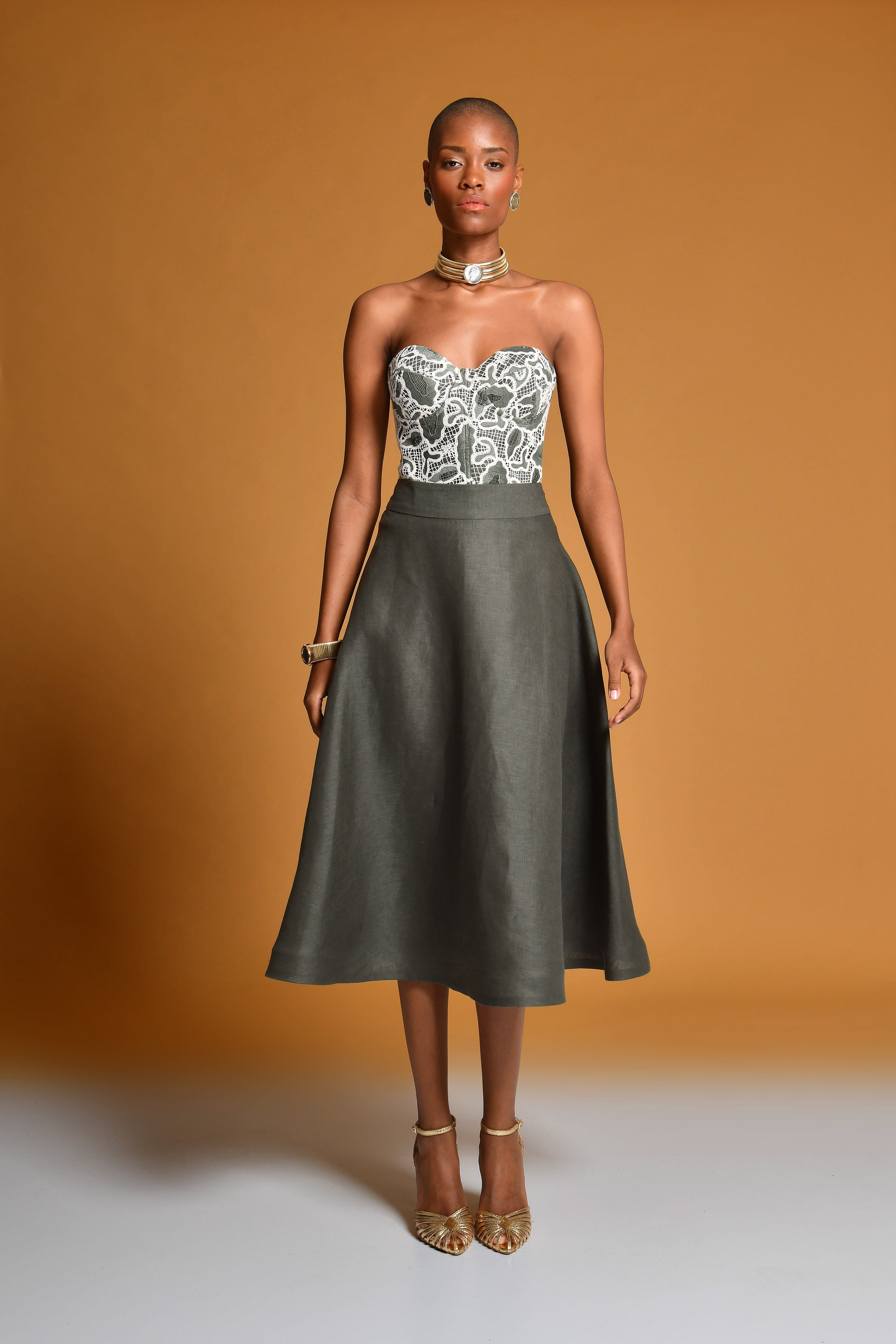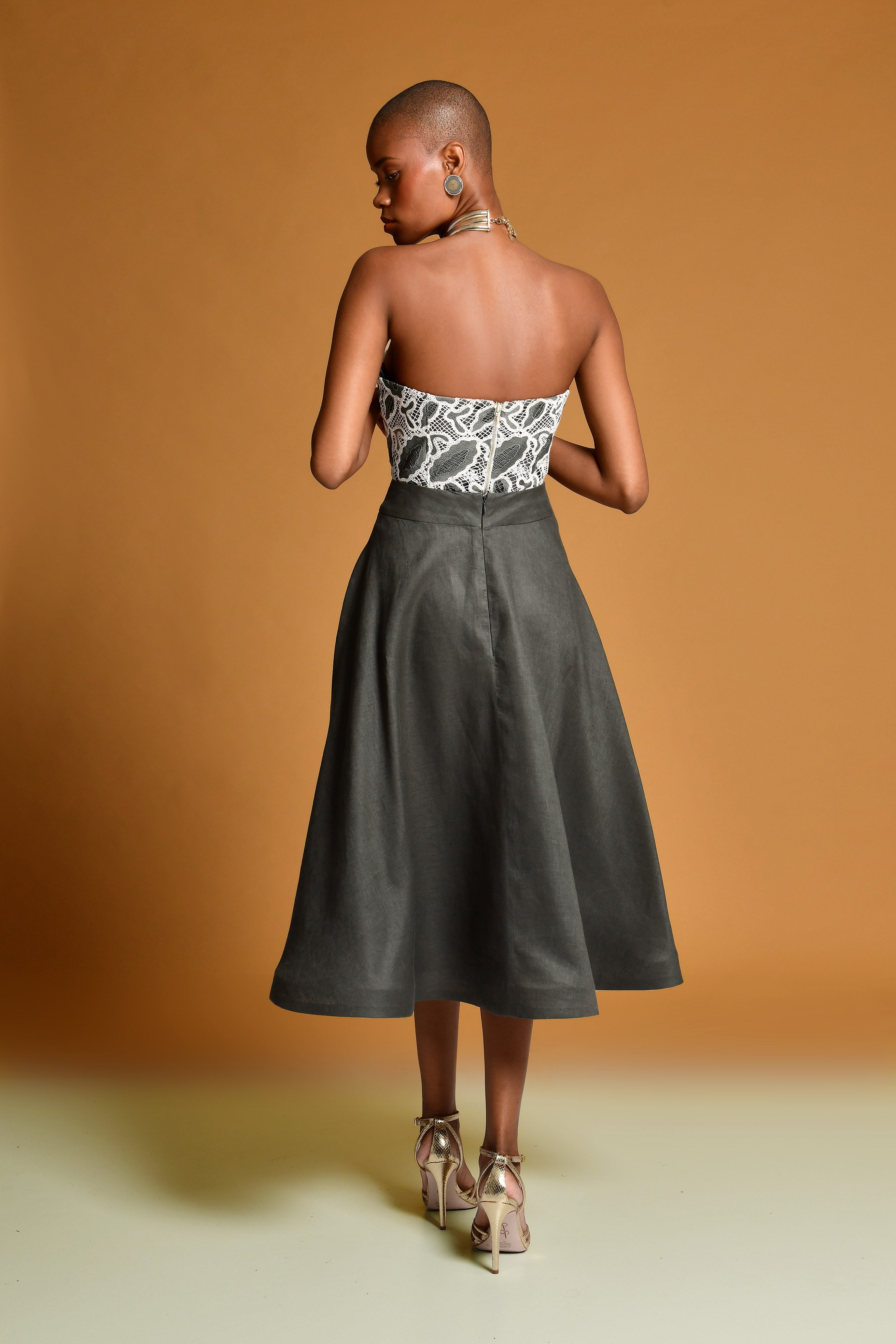 Corset escote corazón con zippers en la parte posterior, falda en lino corte A con volumen.