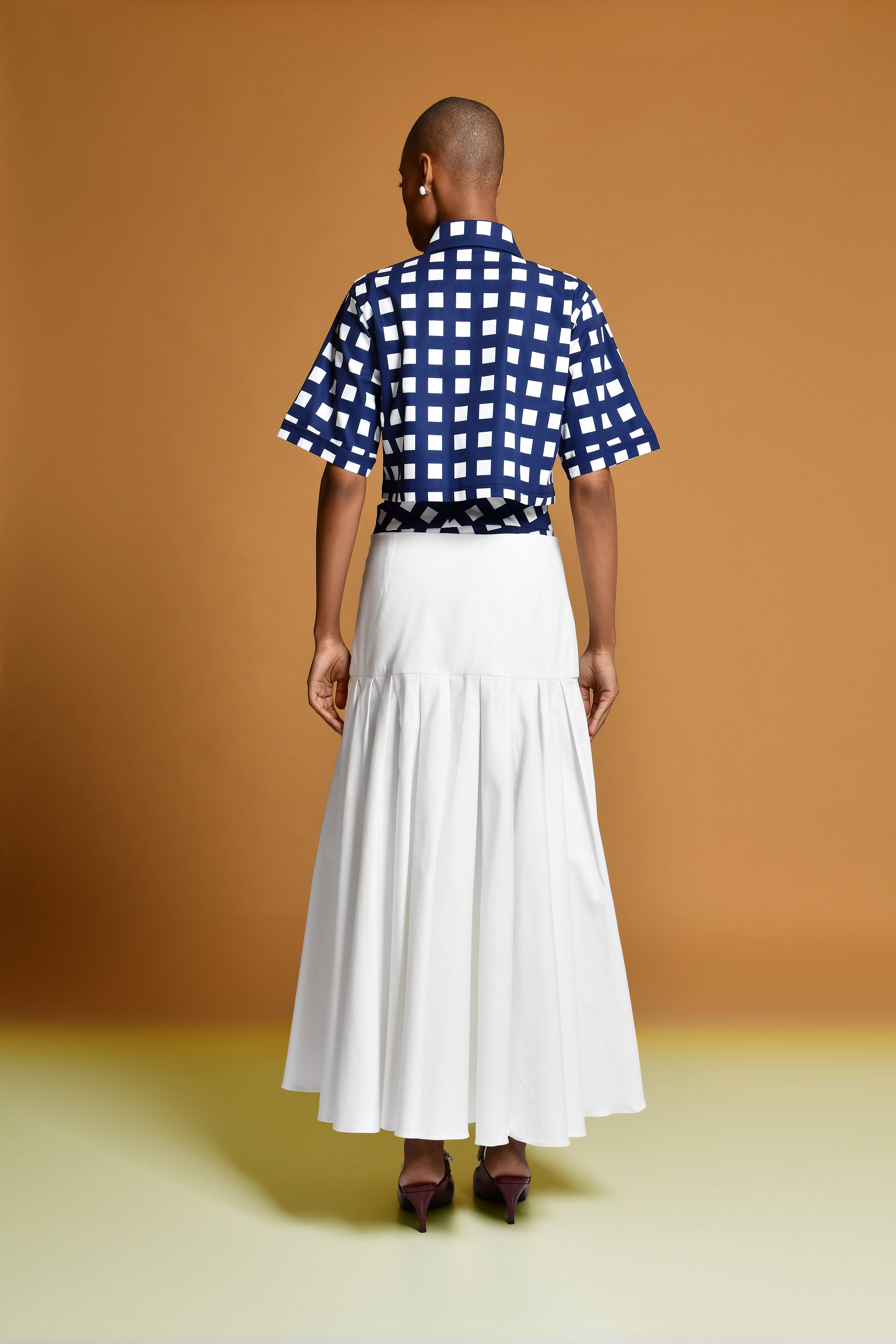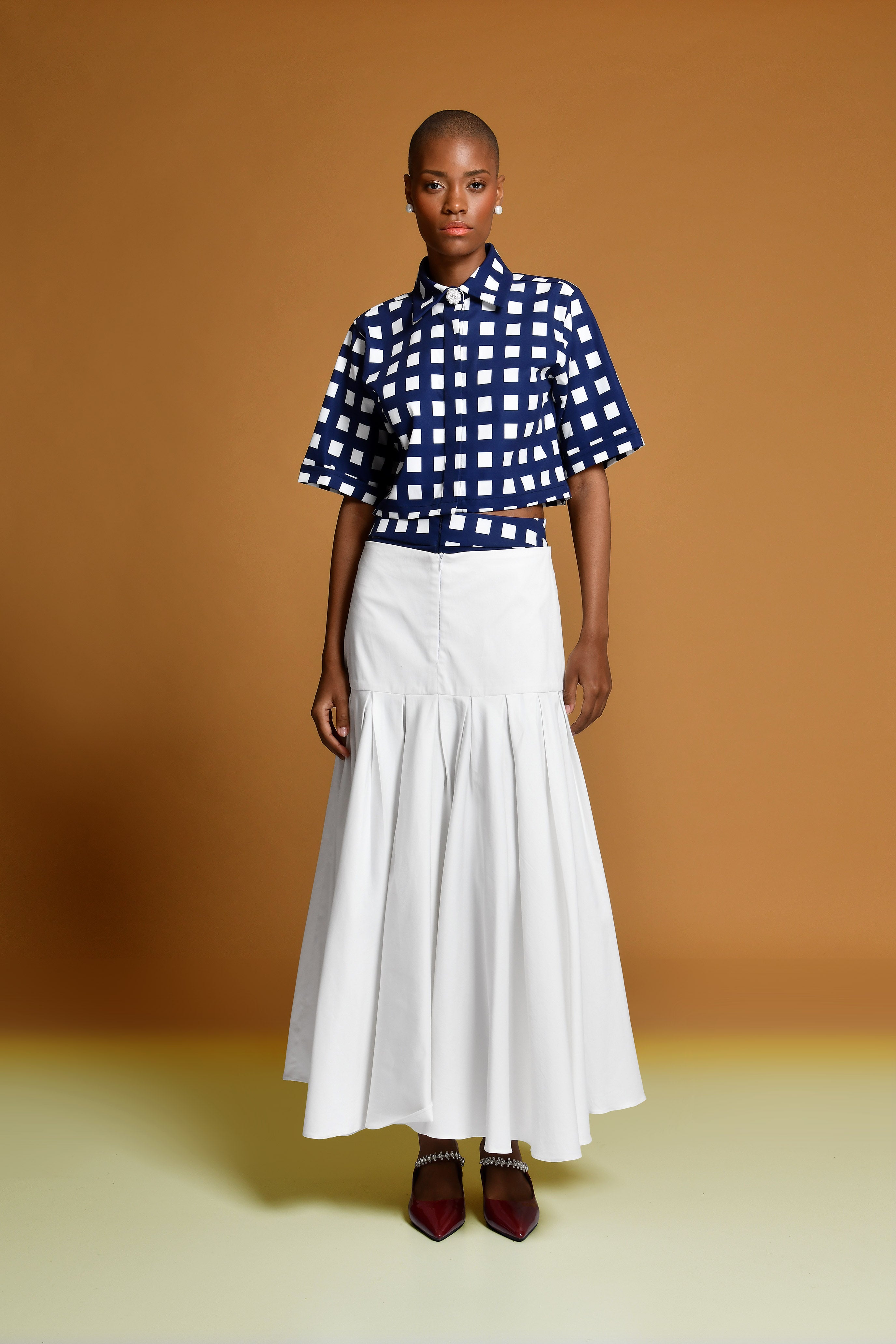 set de camisa básica con largo corto, falda corte lineal A con lleva pretina con la misma...