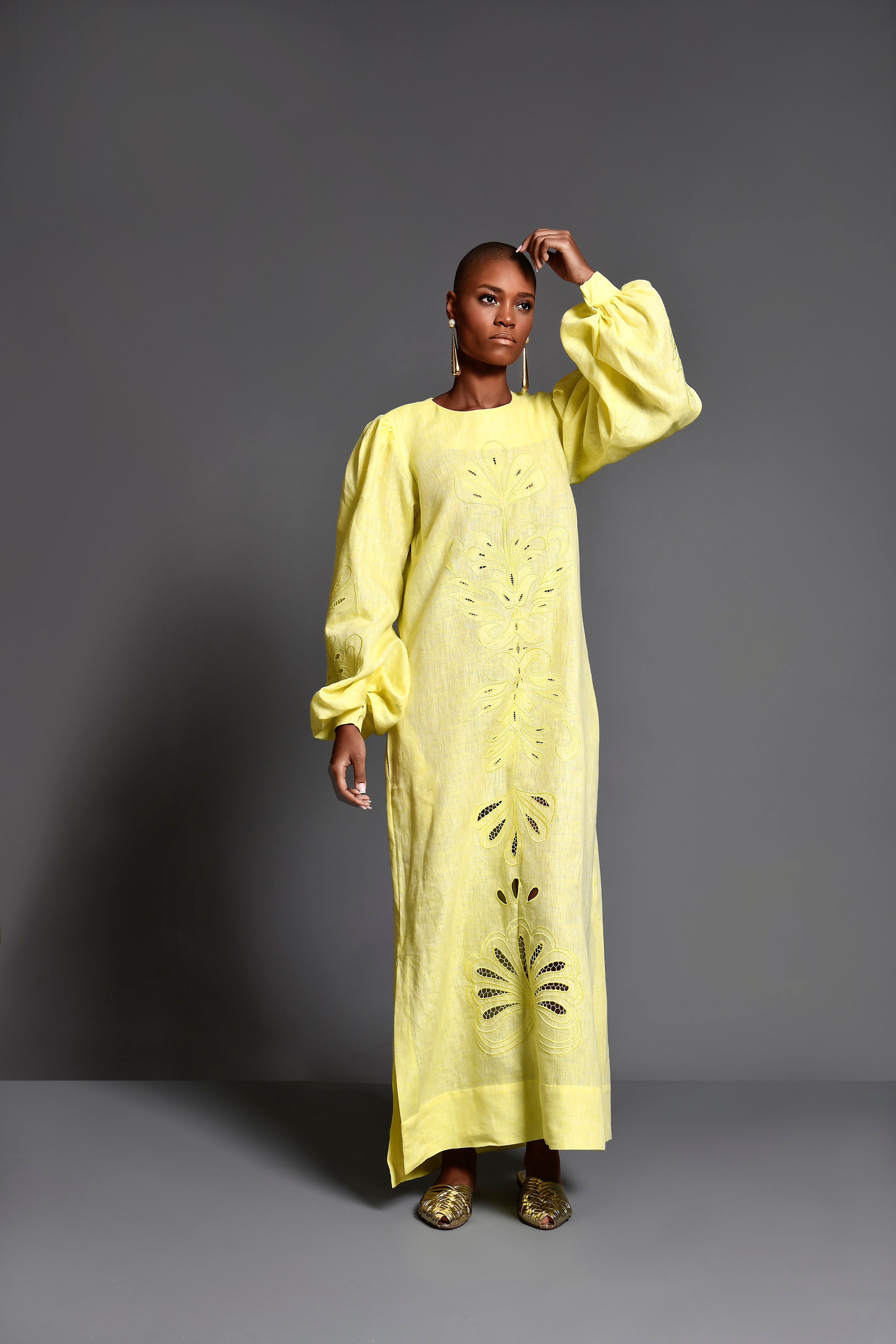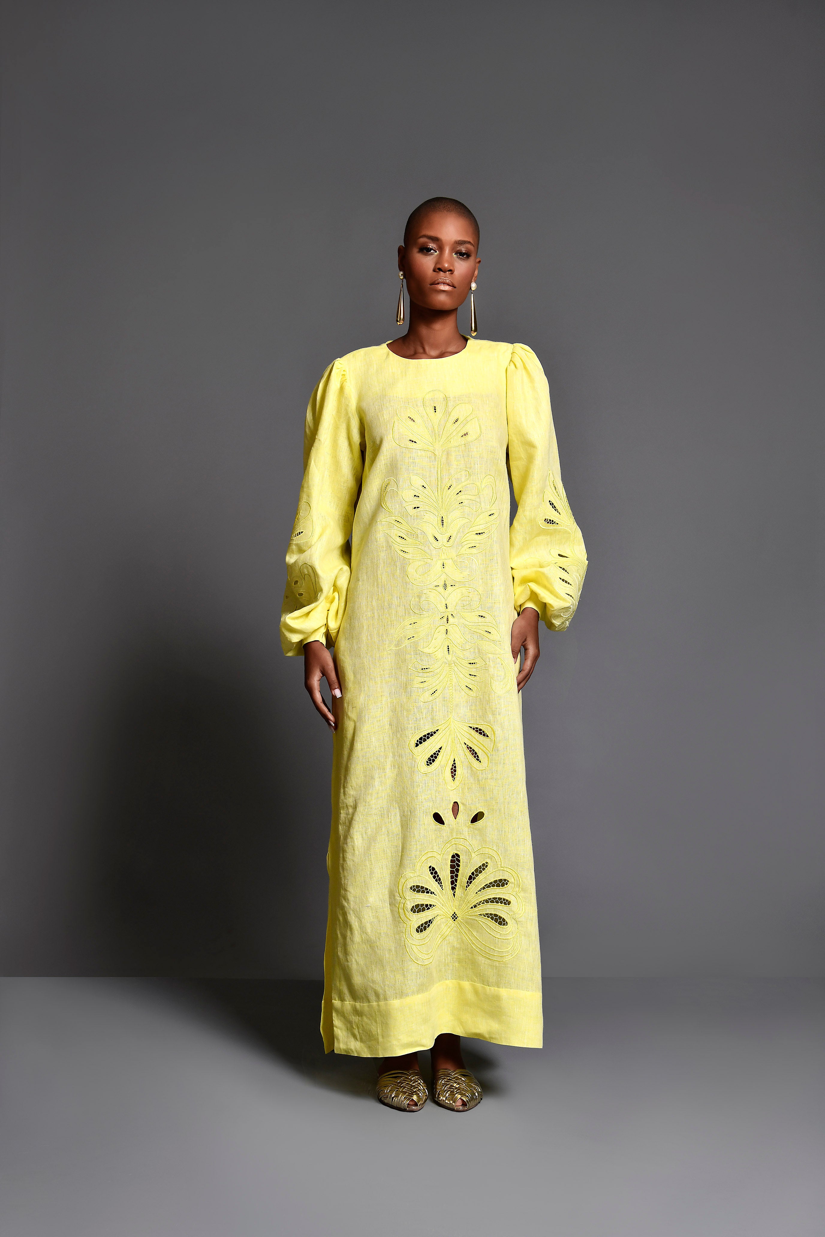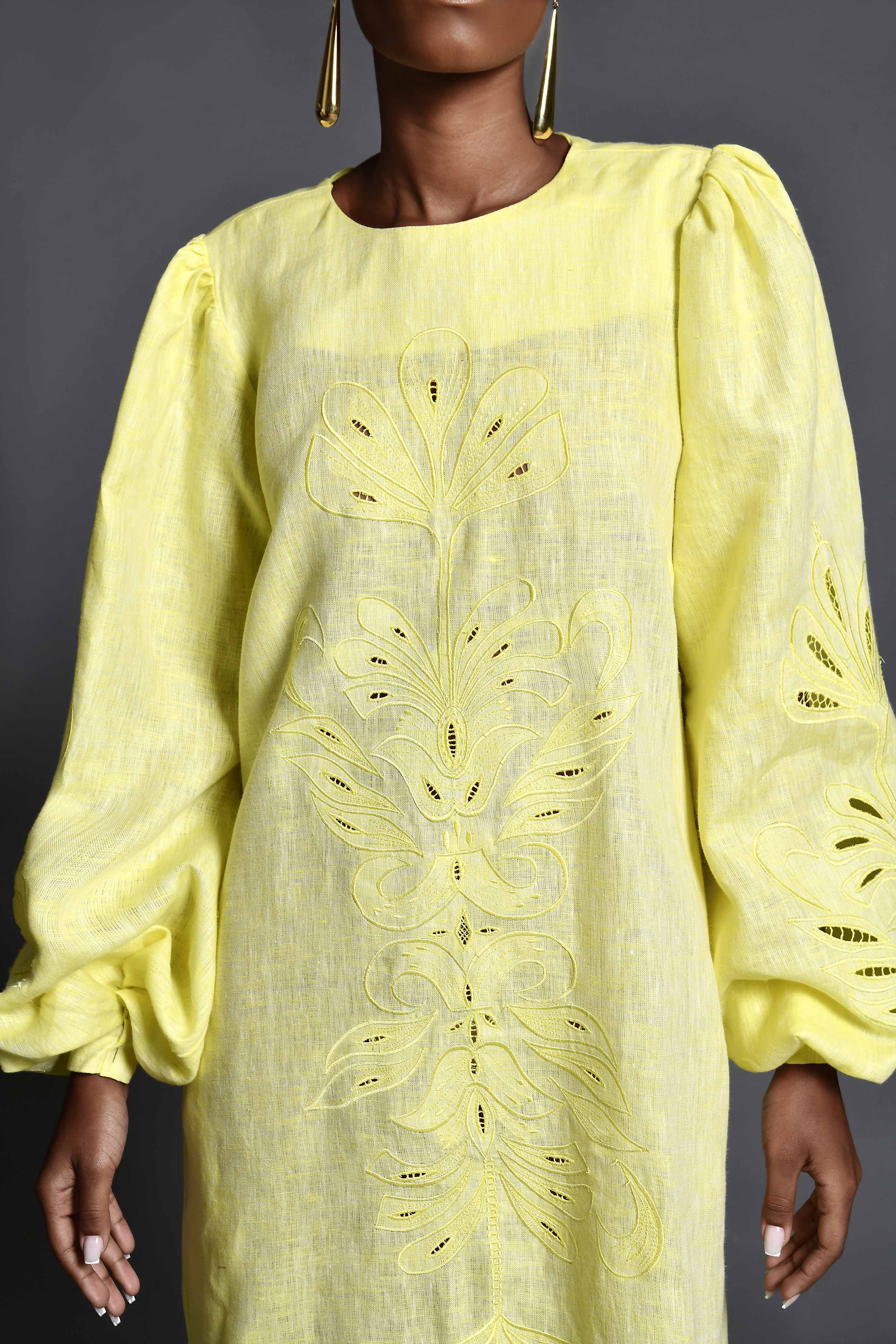 Vestido amarillo bordado y calado