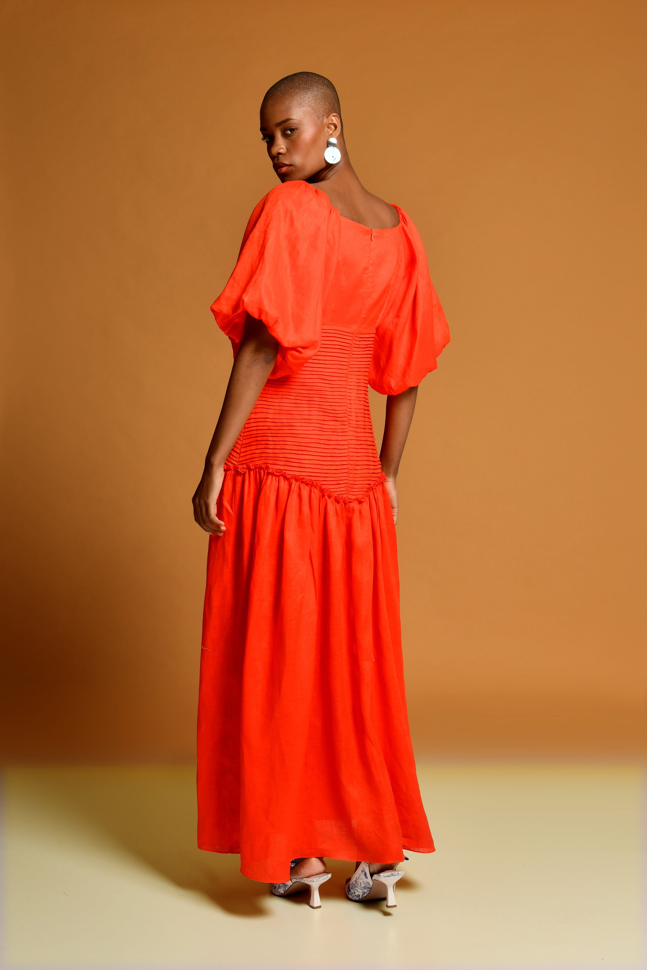 Vestido con mangas globos con pequeña abertura en la parte central del bajo busto con alforzas y...